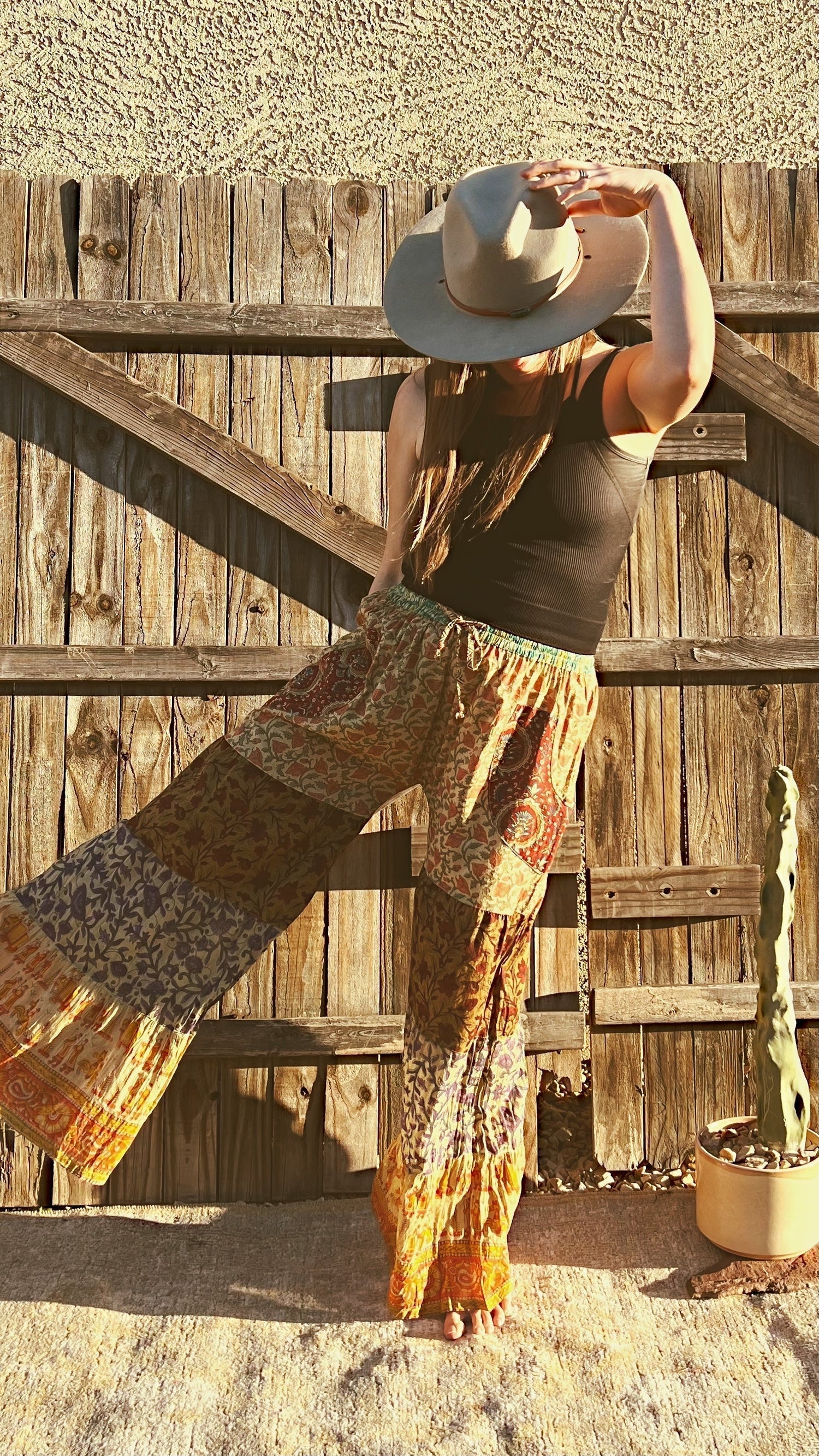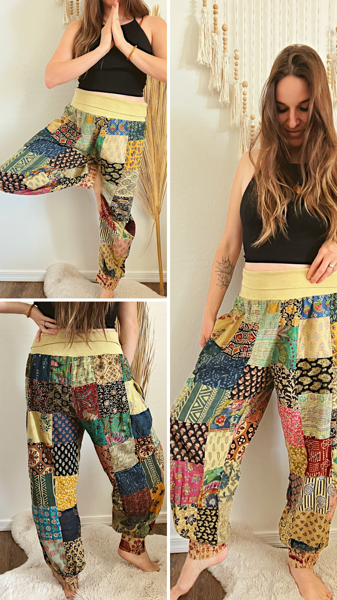 - Ethically made patchwork pants with a super soft, flexible yoga waistband.