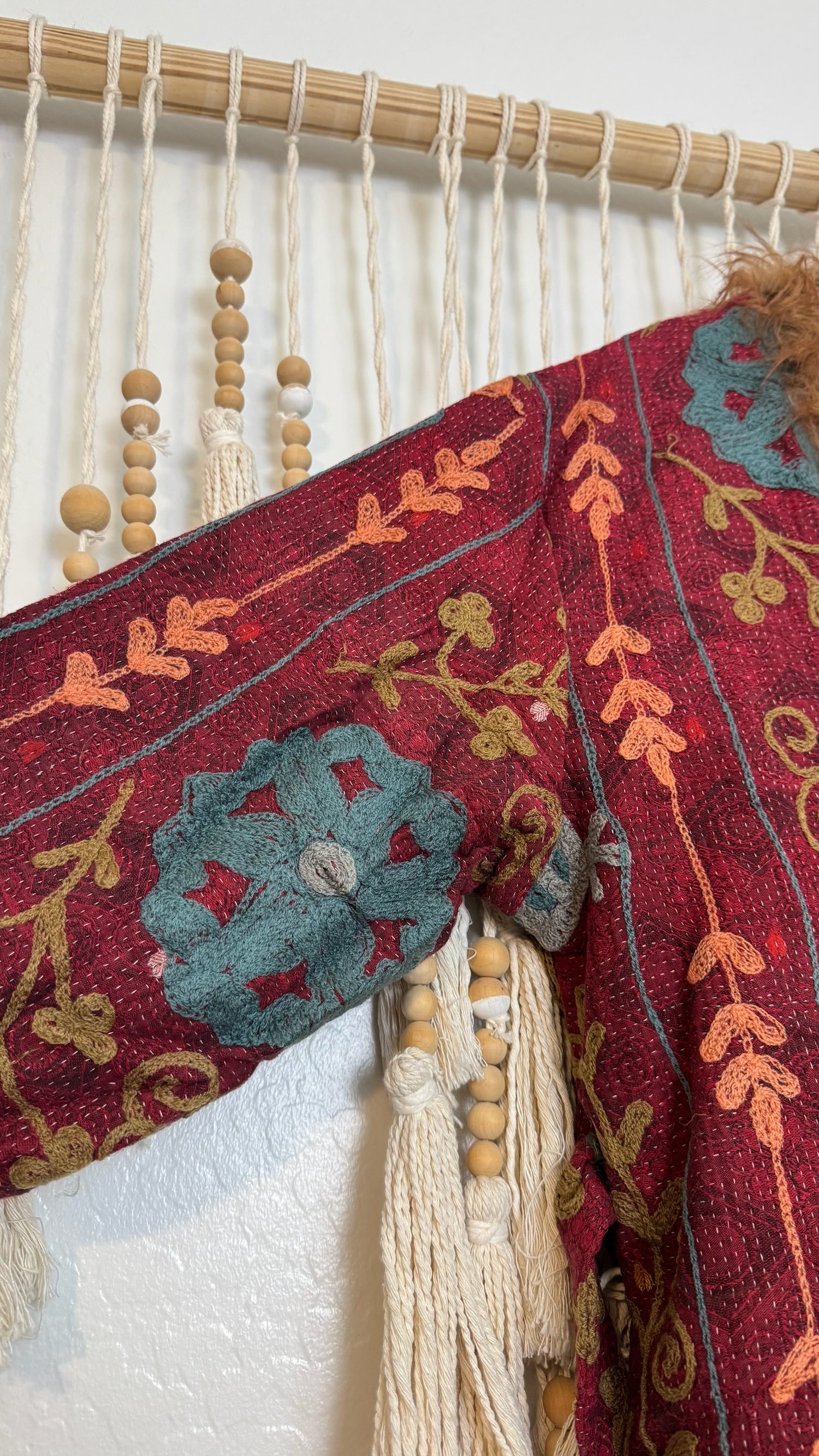 Please note: All sales are final. This style is made with mid- to heavy-weight vintage kantha fabric, handstitched from cotton sari materials. This historic fabric commonly has areas of thinning, discoloration, stray threads, and it is common for holes and fabric thinning to be present throughout the first layer of fabric. Each jacket has multiple layers of cotton sari that is handstitched into intricate, one-of-a-kind patterns. This style of distressed fabric is intentional, celebrated for its age and historical wear, and these characteristics do not indicate a flaw or impact the overall function of the garment.