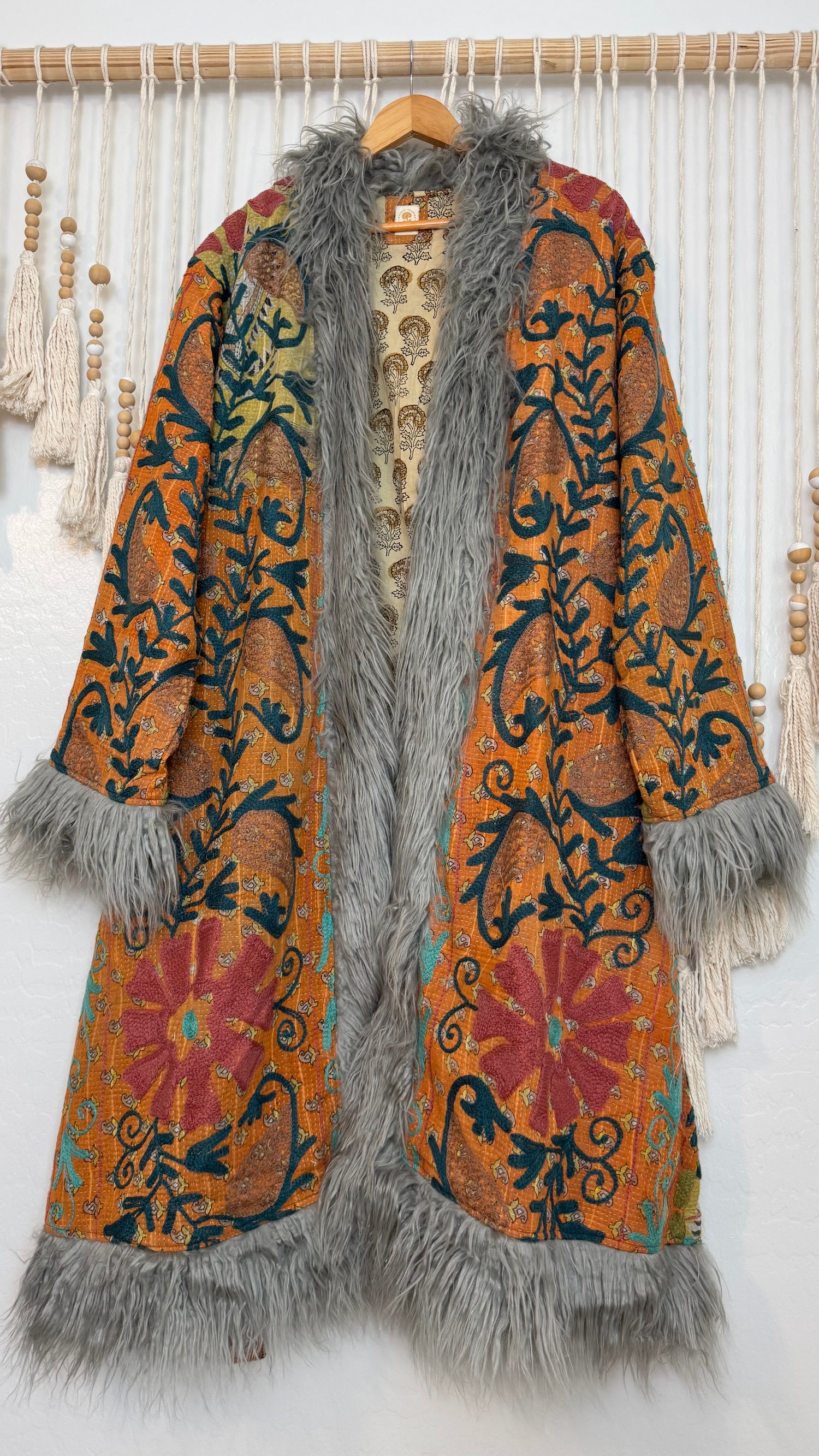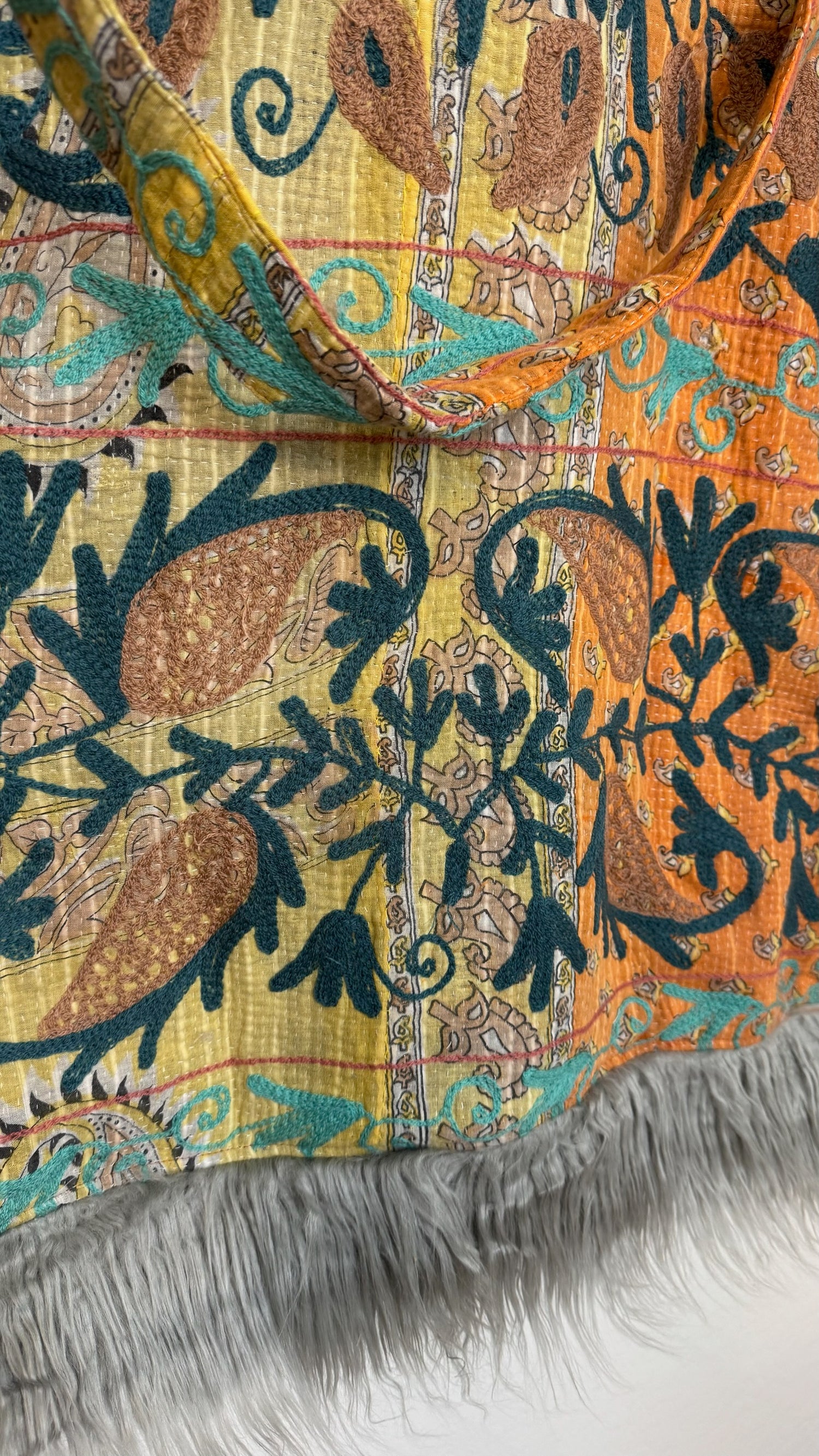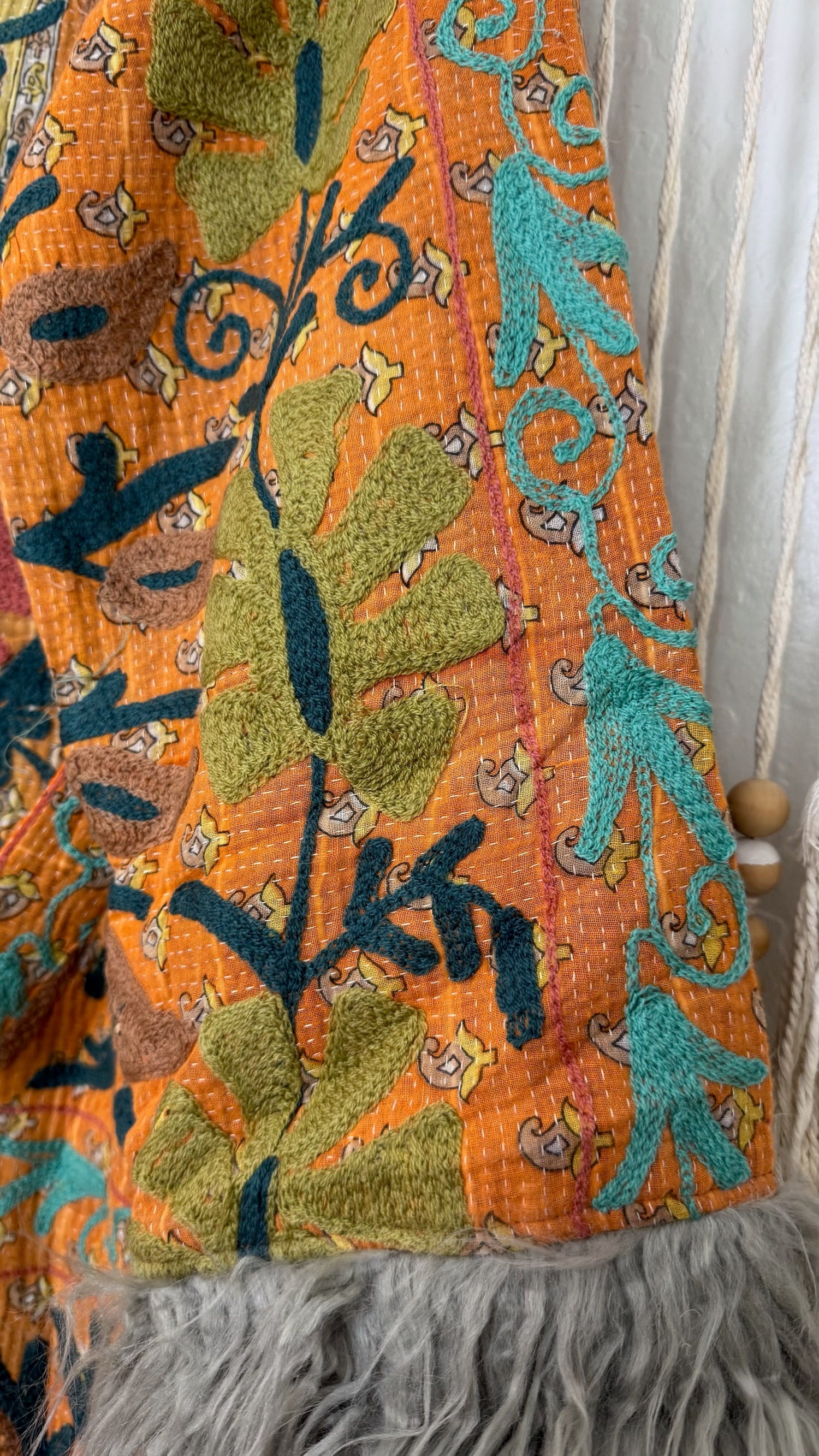 • 100% vintage cotton kantha saris, premium faux fur, and hand block printed cotton lining.