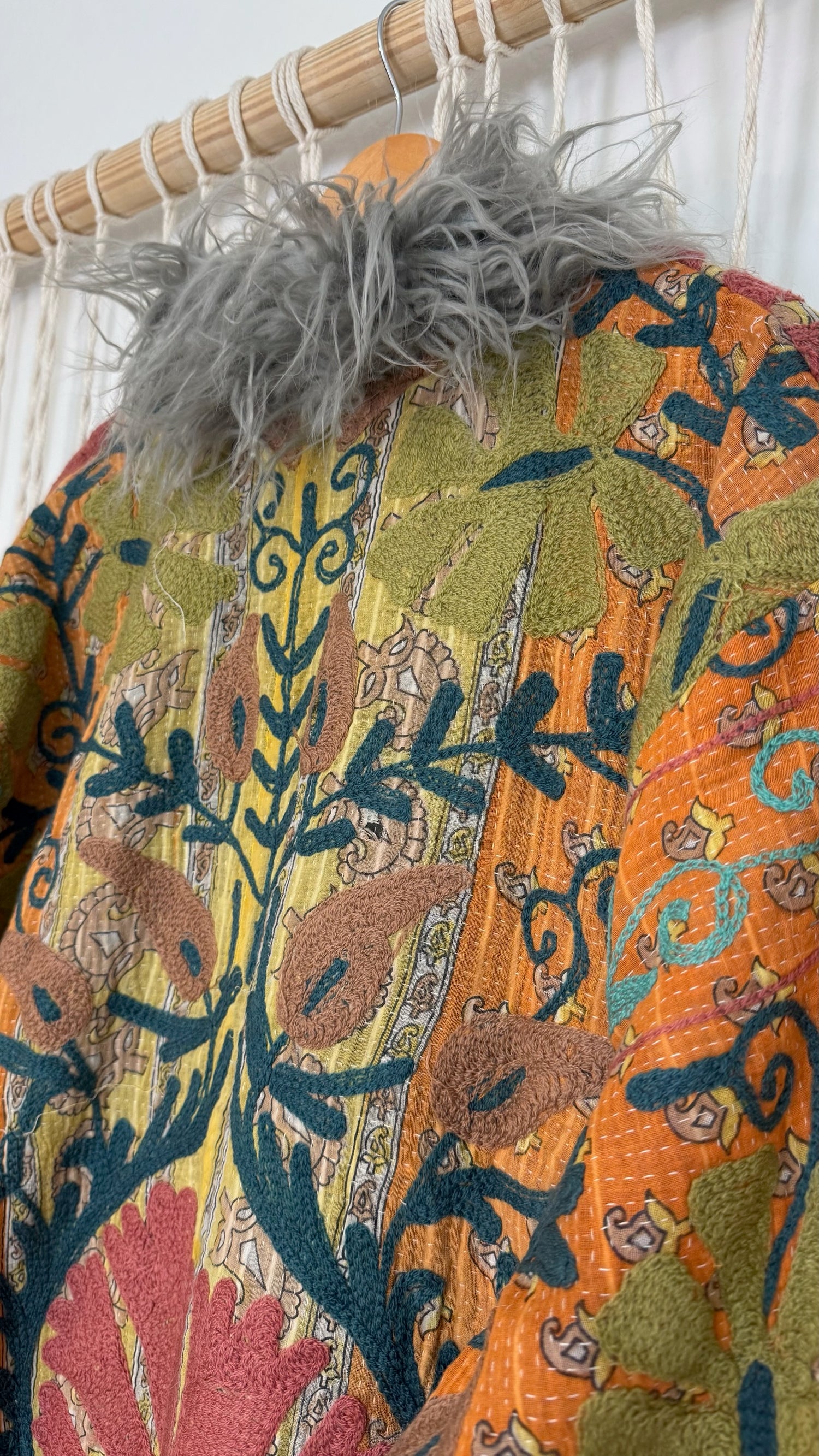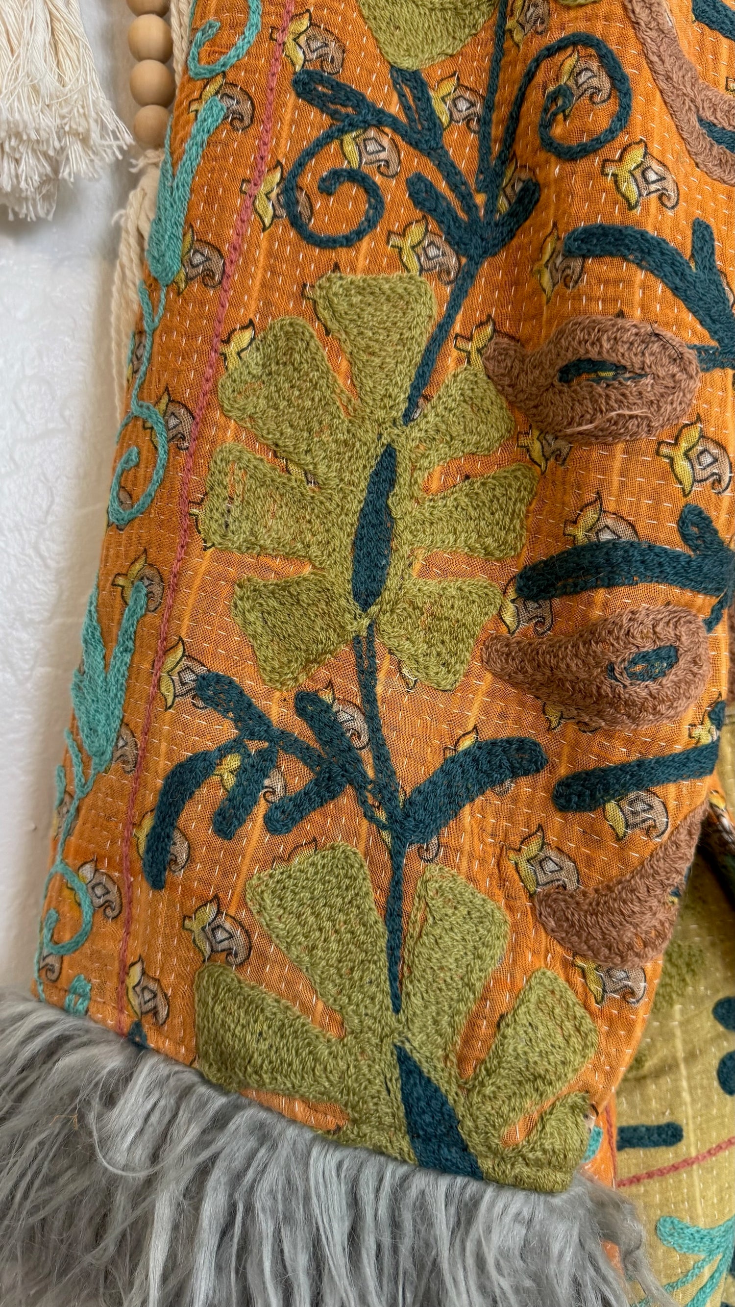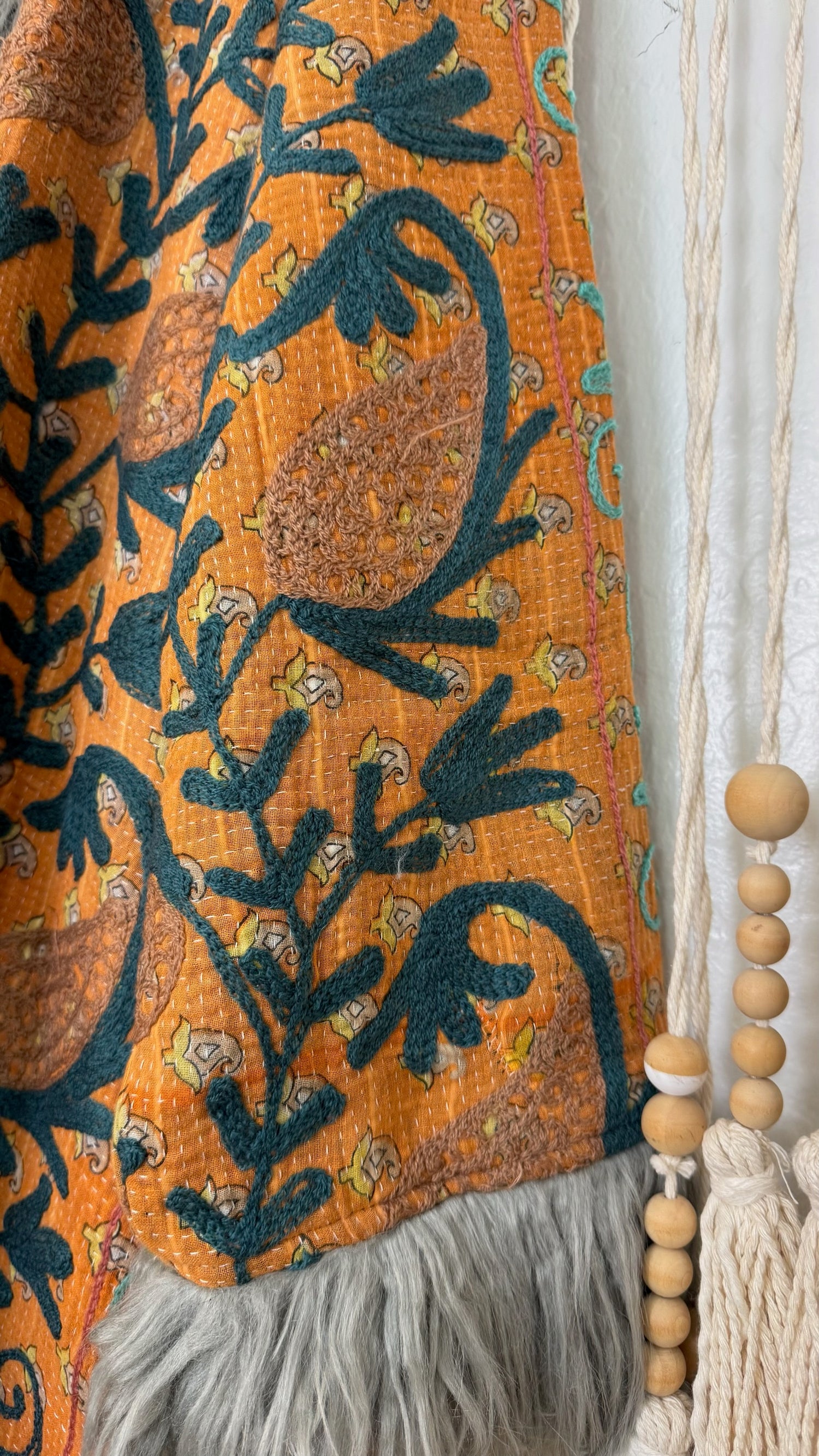 • 100% vintage cotton kantha saris, premium faux fur, and hand block printed cotton lining.