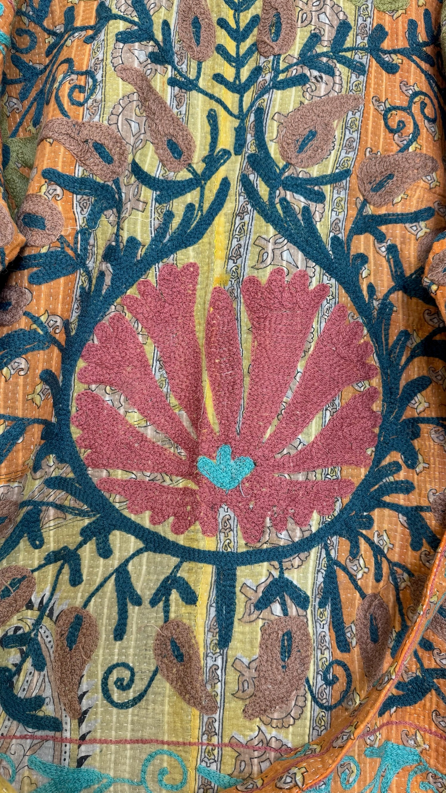 Please note: All sales are final. This style is made with mid- to heavy-weight vintage kantha fabric, handstitched from cotton sari materials. This historic fabric commonly has areas of thinning, discoloration, stray threads, and it is common for holes and fabric thinning to be present throughout the first layer of fabric. Each jacket has multiple layers of cotton sari that is handstitched into intricate, one-of-a-kind patterns. This style of distressed fabric is intentional, celebrated for its age and historical wear, and these characteristics do not indicate a flaw or impact the overall function of the garment.