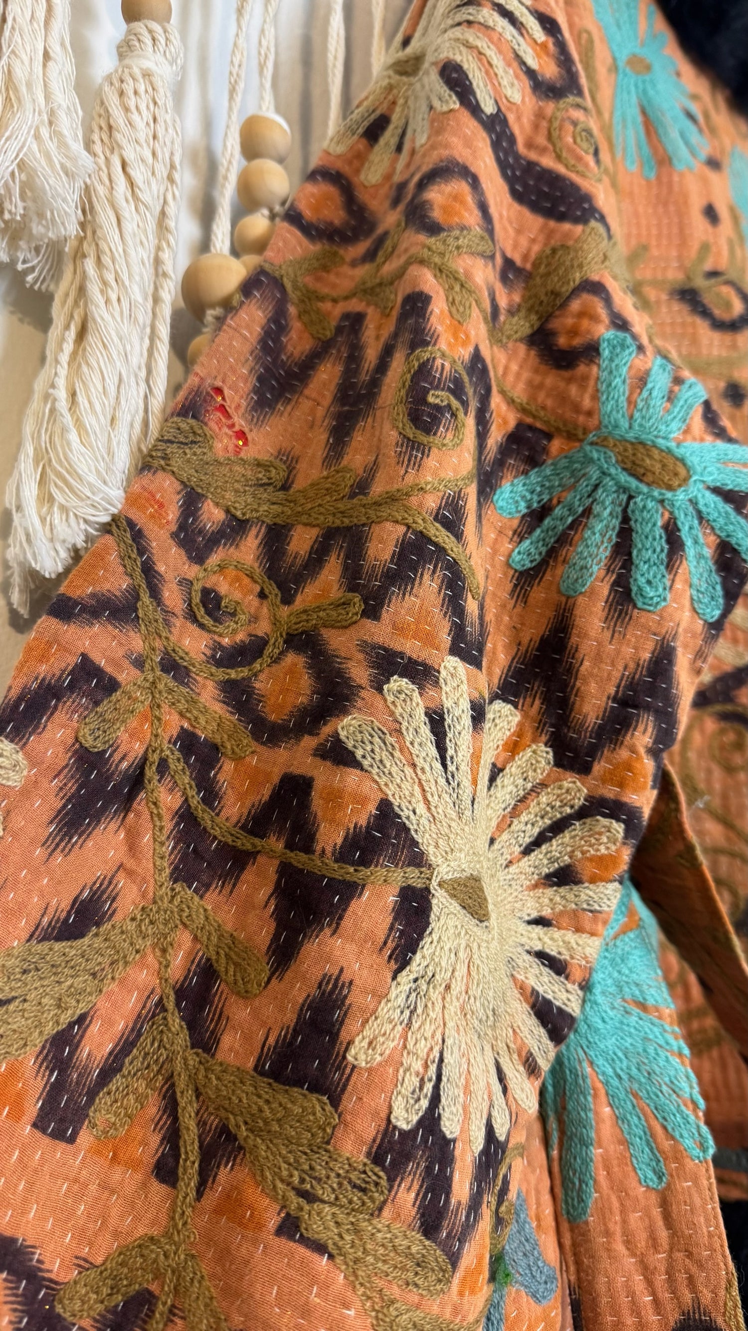 Please note: All sales are final. This style is made with mid- to heavy-weight vintage kantha fabric, handstitched from cotton sari materials. This historic fabric commonly has areas of thinning, discoloration, stray threads, and it is common for holes and fabric thinning to be present throughout the first layer of fabric. Each jacket has multiple layers of cotton sari that is handstitched into intricate, one-of-a-kind patterns. This style of distressed fabric is intentional, celebrated for its age and historical wear, and these characteristics do not indicate a flaw or impact the overall function of the garment.