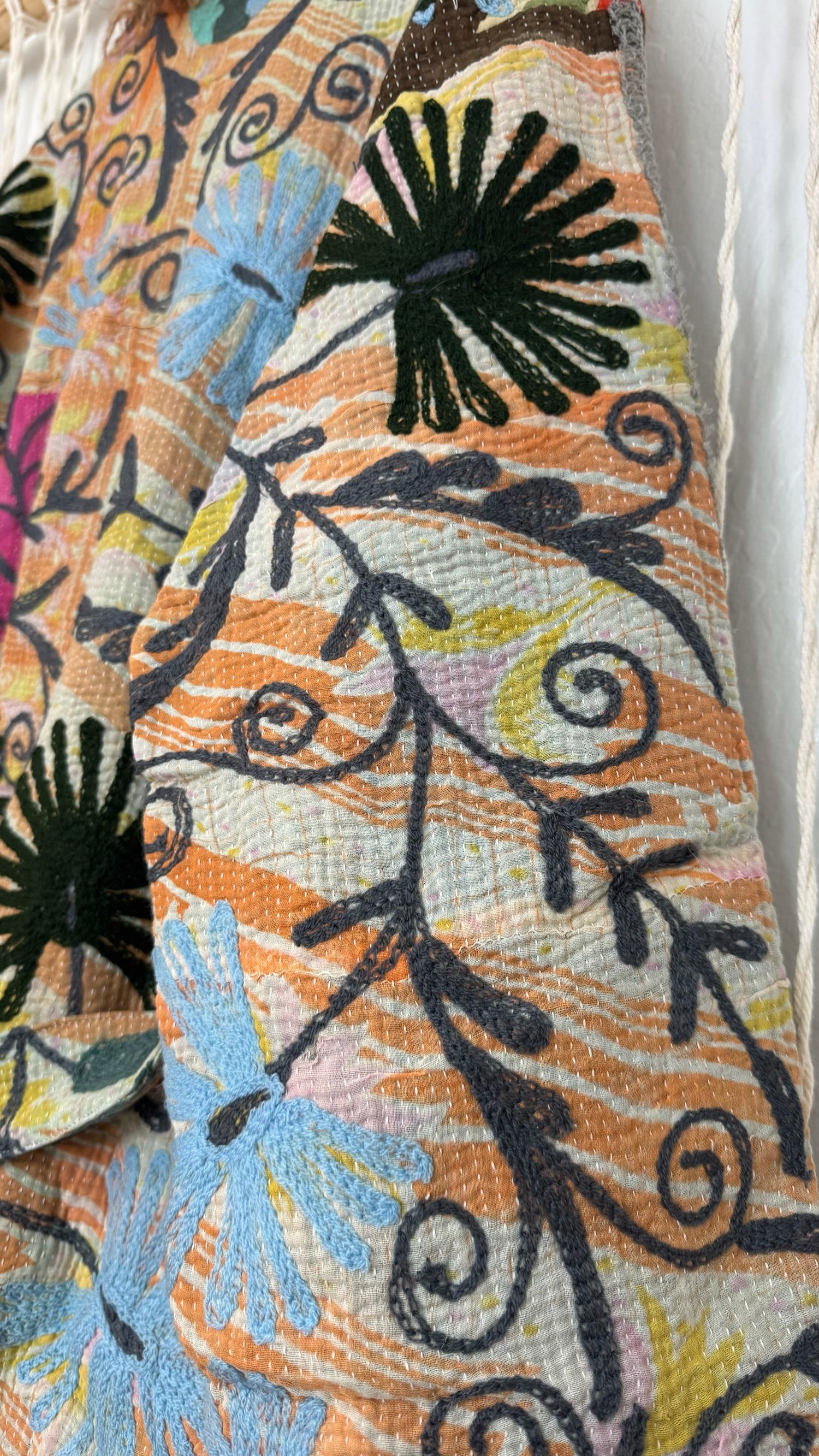 Please note: All sales are final. This style is made with mid- to heavy-weight vintage kantha fabric, handstitched from cotton sari materials. This historic fabric commonly has areas of thinning, discoloration, stray threads, and it is common for holes and fabric thinning to be present throughout the first layer of fabric. Each jacket has multiple layers of cotton sari that is handstitched into intricate, one-of-a-kind patterns. This style of distressed fabric is intentional, celebrated for its age and historical wear, and these characteristics do not indicate a flaw or impact the overall function of the garment.