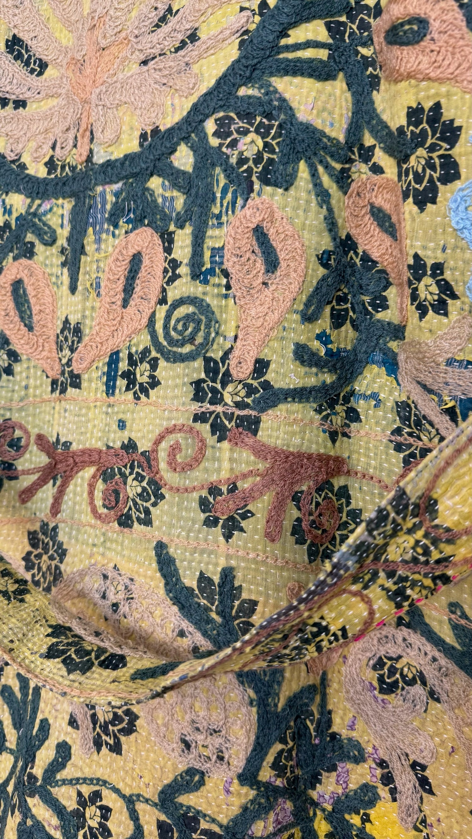 Please note: All sales are final. This style is made with mid- to heavy-weight vintage kantha fabric, handstitched from cotton sari materials. This historic fabric commonly has areas of thinning, discoloration, stray threads, and it is common for holes and fabric thinning to be present throughout the first layer of fabric. Each jacket has multiple layers of cotton sari that is handstitched into intricate, one-of-a-kind patterns. This style of distressed fabric is intentional, celebrated for its age and historical wear, and these characteristics do not indicate a flaw or impact the overall function of the garment.