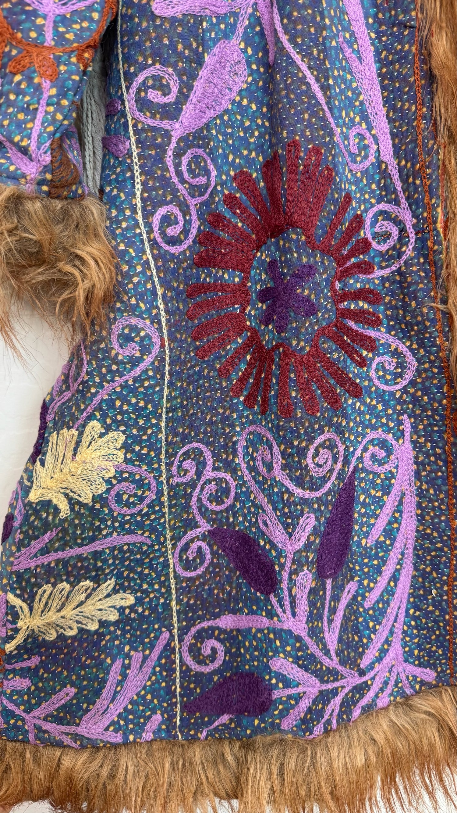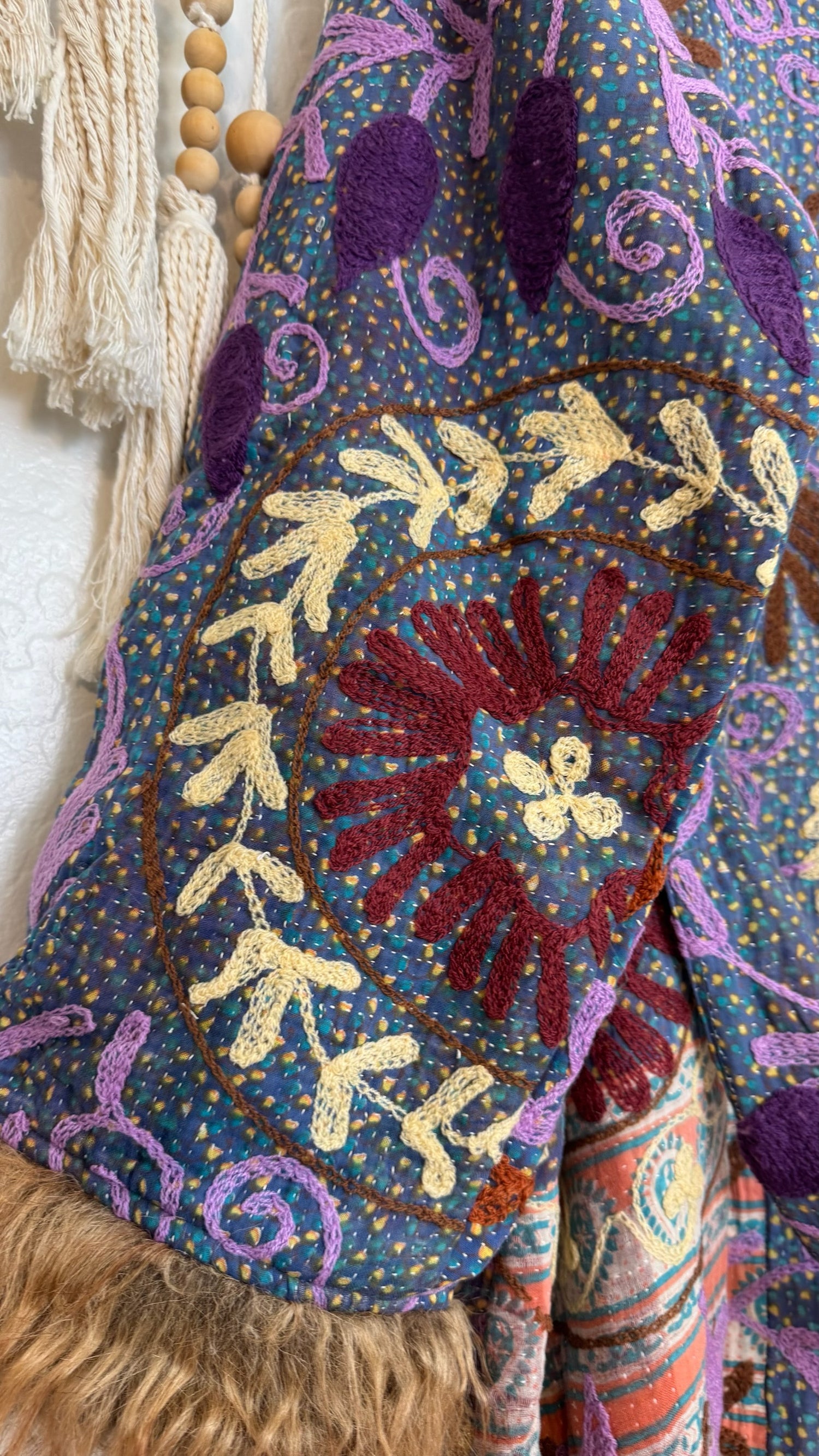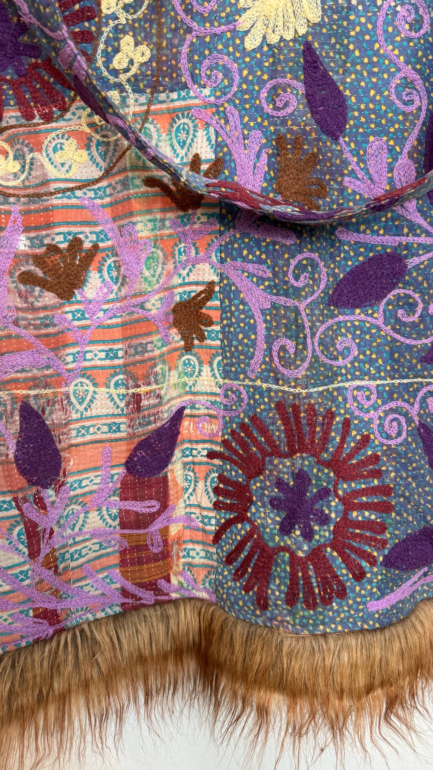 • 100% vintage cotton kantha saris, premium faux fur, and hand block printed cotton lining.
