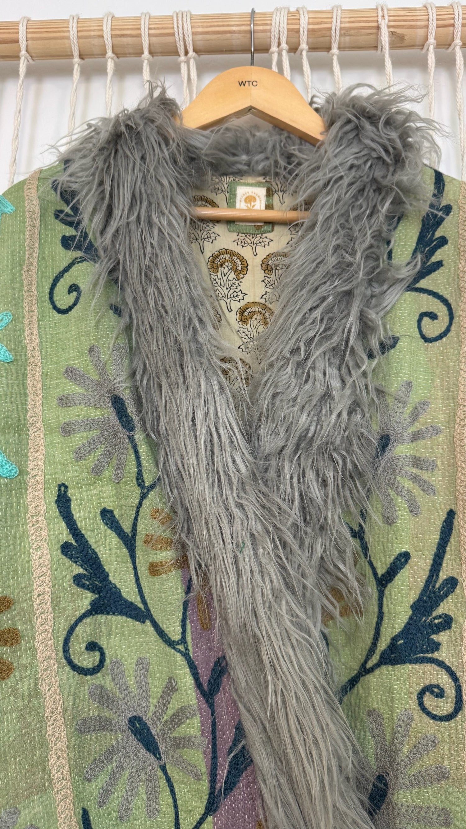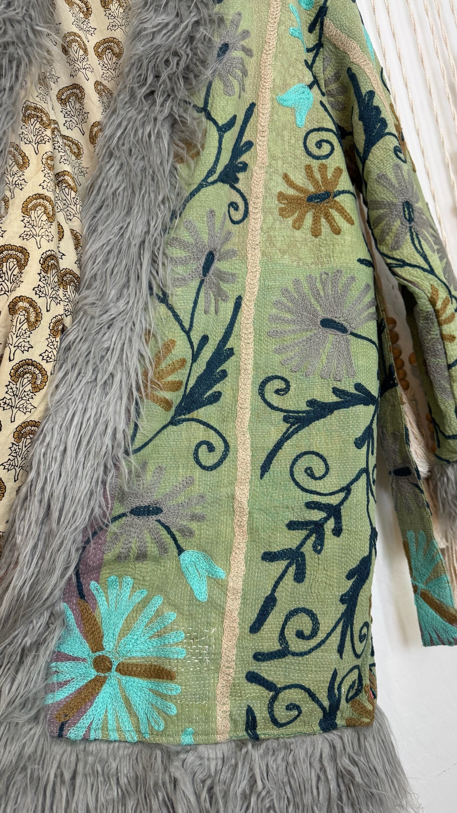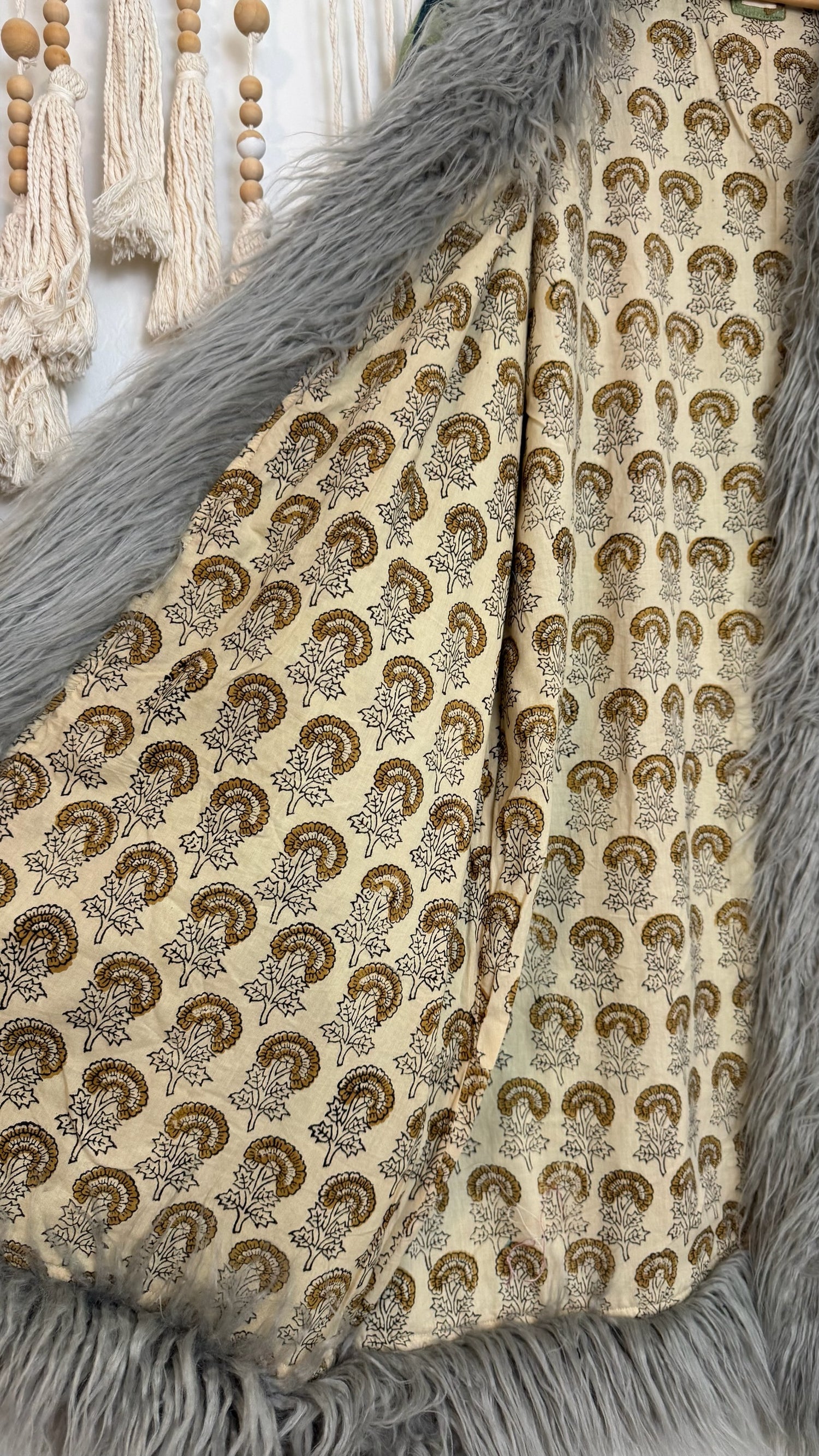 • 100% vintage cotton kantha saris, premium faux fur, and hand block printed cotton lining.