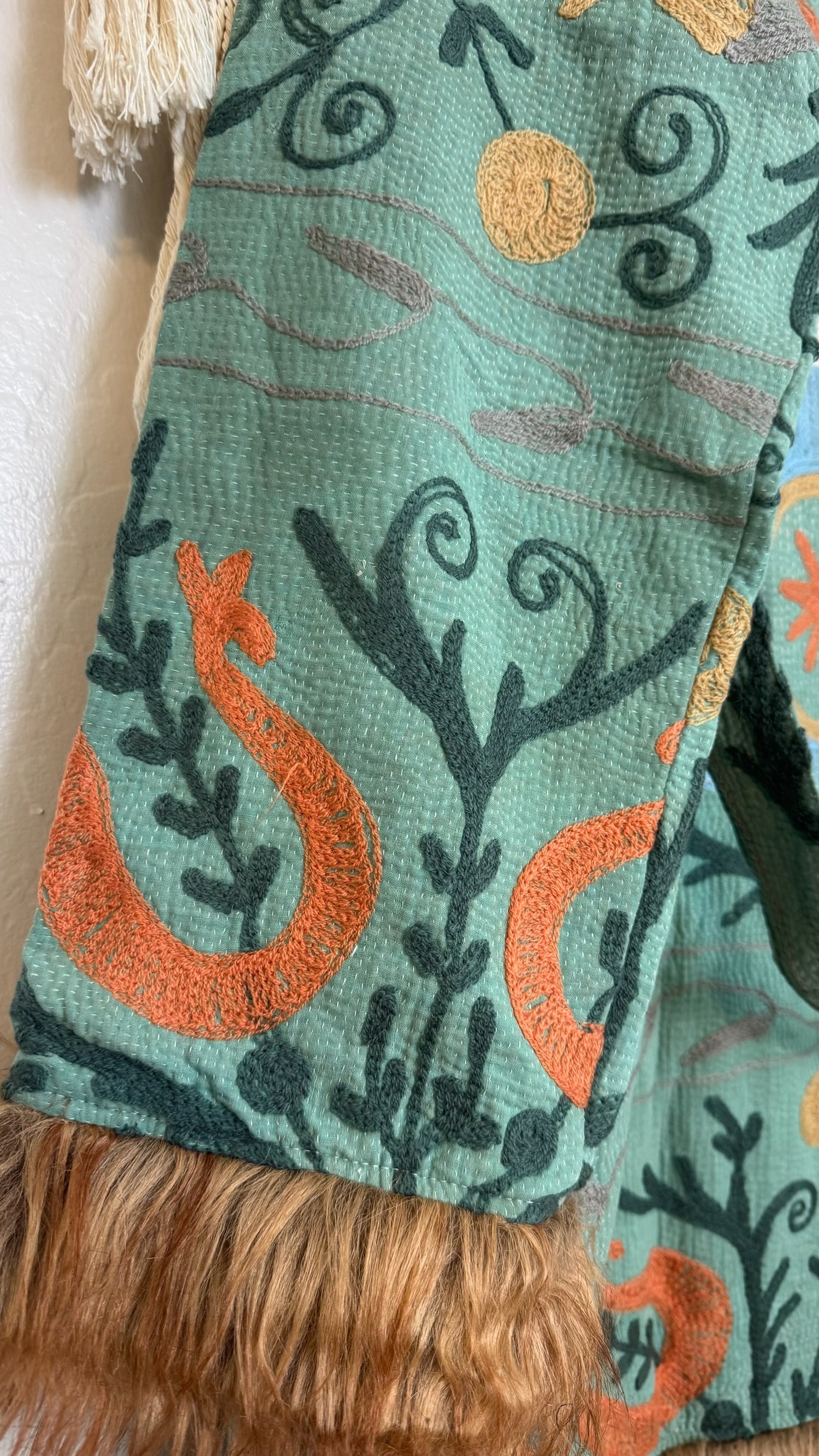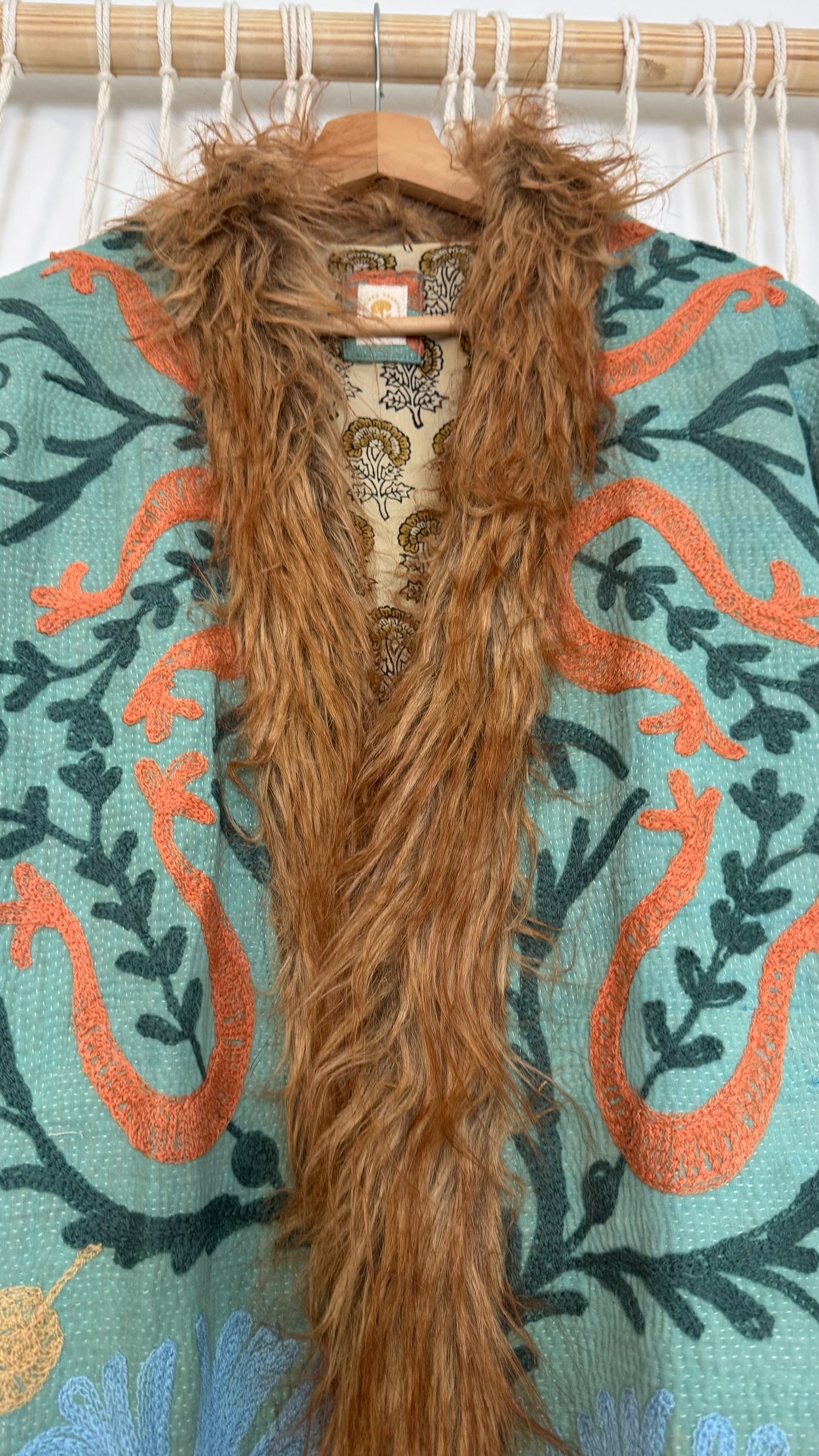• 100% vintage cotton kantha saris, premium faux fur, and hand block printed cotton lining.