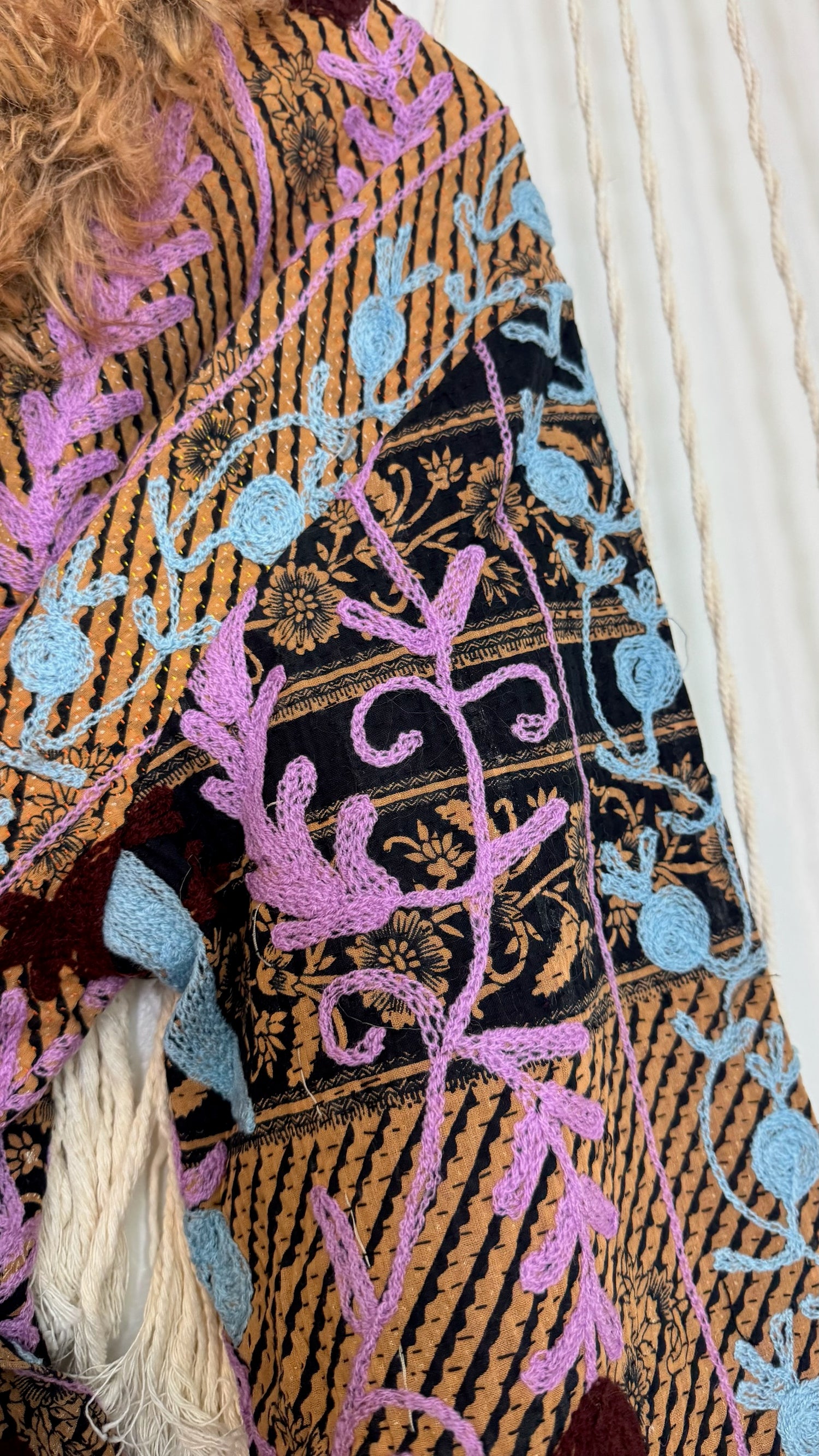 Please note: All sales are final. This style is made with mid- to heavy-weight vintage kantha fabric, handstitched from cotton sari materials. This historic fabric commonly has areas of thinning, discoloration, stray threads, and it is common for holes and fabric thinning to be present throughout the first layer of fabric. Each jacket has multiple layers of cotton sari that is handstitched into intricate, one-of-a-kind patterns. This style of distressed fabric is intentional, celebrated for its age and historical wear, and these characteristics do not indicate a flaw or impact the overall function of the garment.