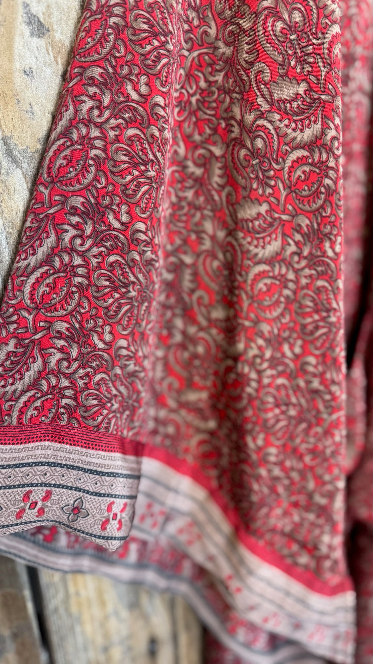 Please refer to our Silk Guide for descriptions onย each type of silk texture. Texture of silk will vary across each garment, as this style of kimono is handmade from 100% recycled sari silk material.ย