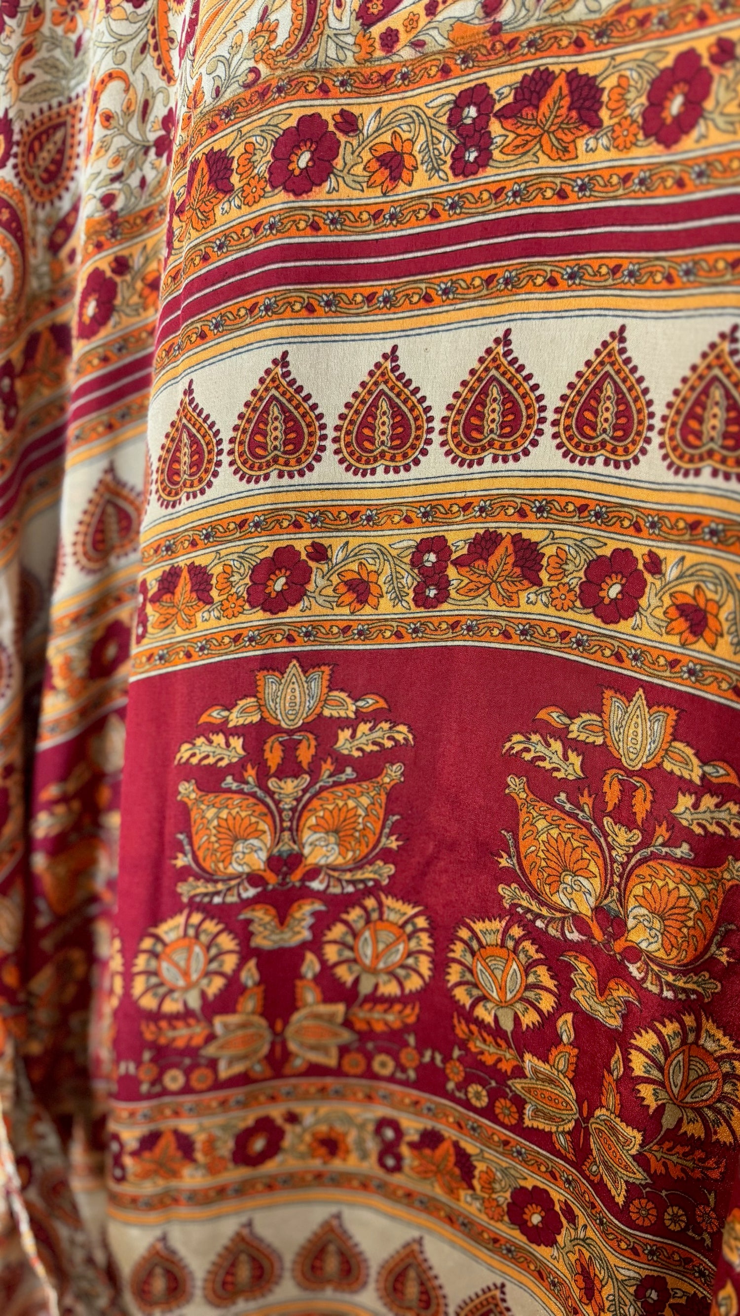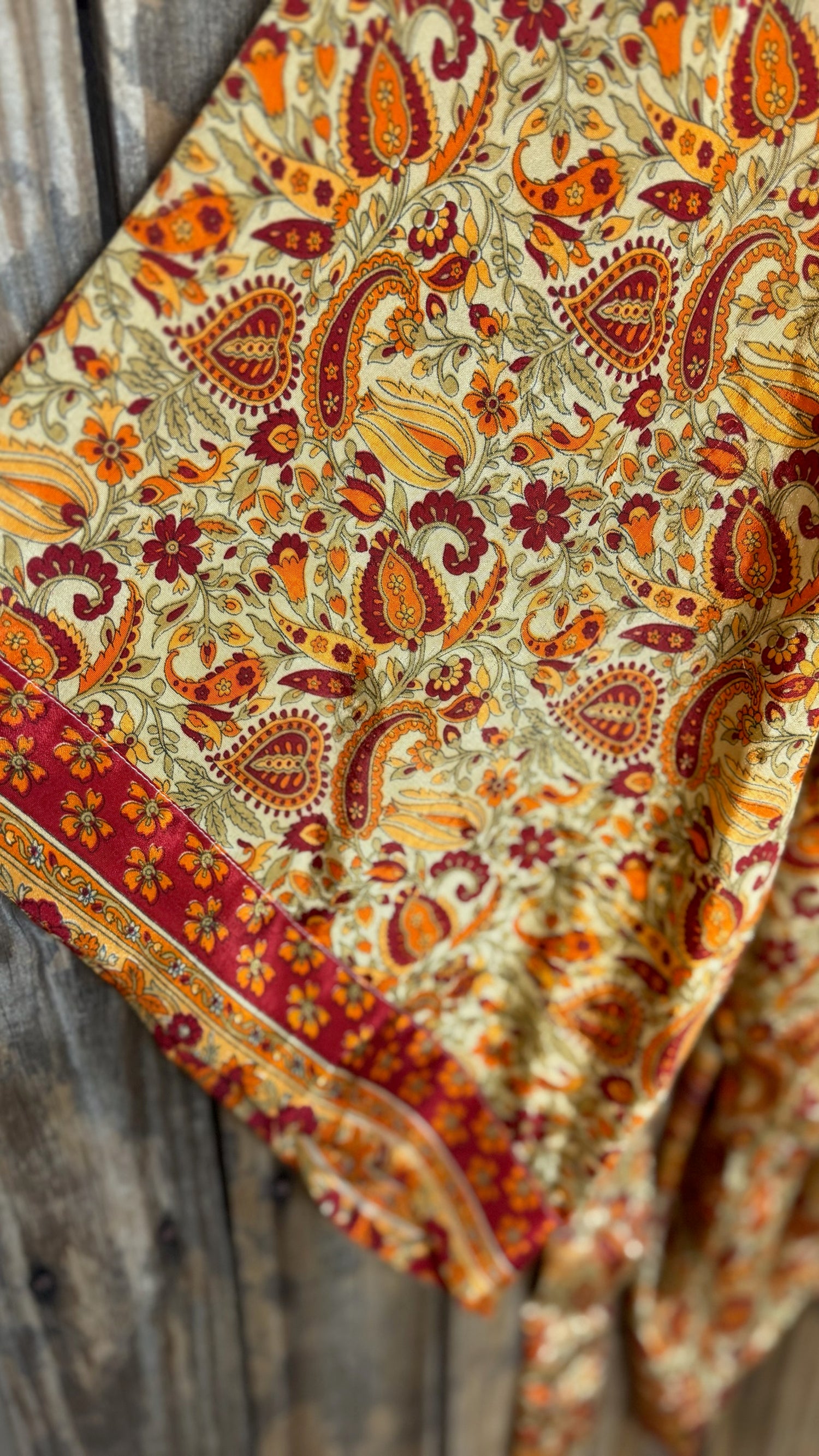 Please refer to our Silk Guide for descriptions onย each type of silk texture. Texture of silk will vary across each garment, as this style of kimono is handmade from 100% recycled sari silk material.ย