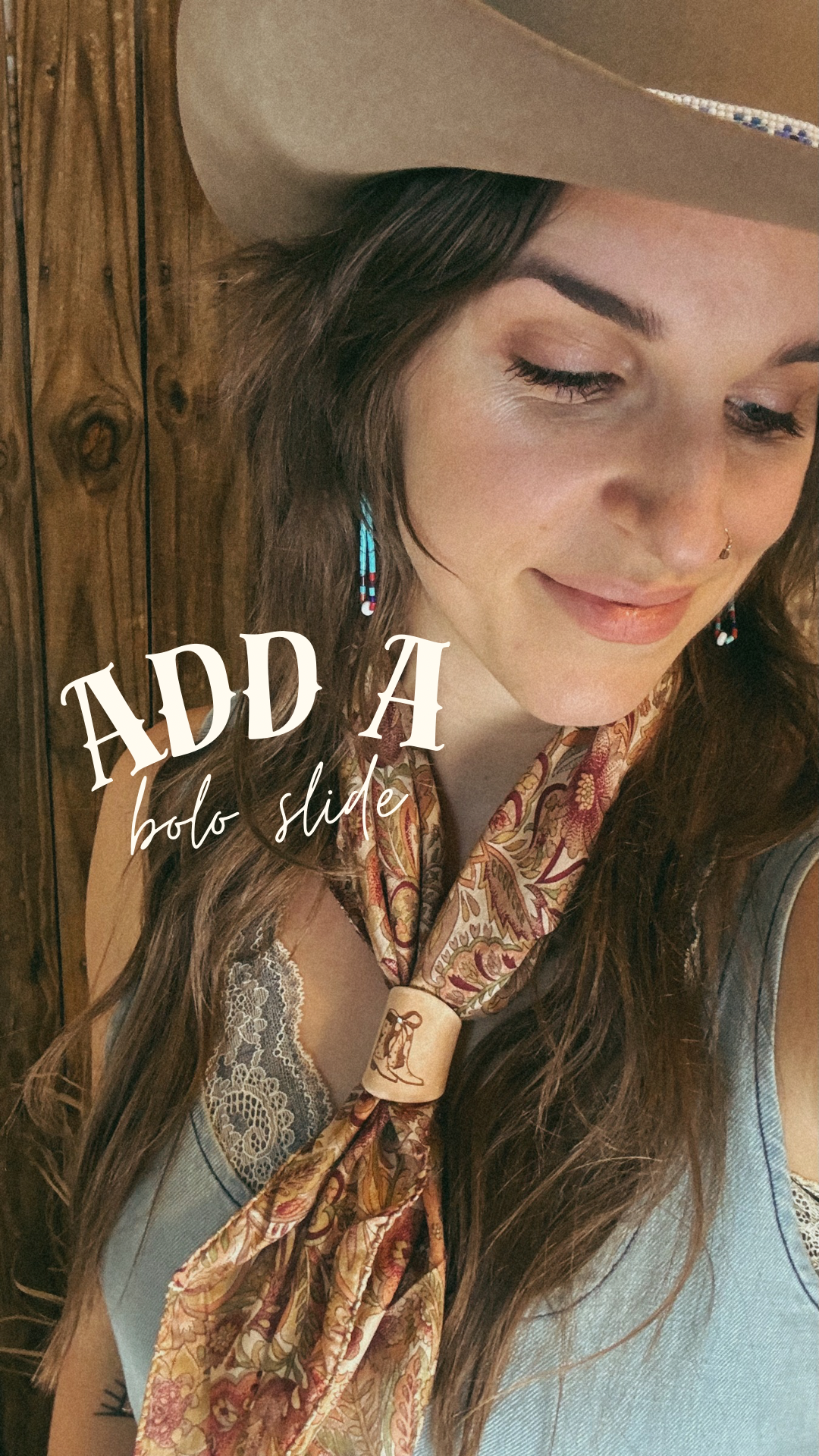 But this bandana isn't just for wrapping around your neck - the possibilities are endless! You can pair it with a variety of bolo slide options for a truly unique look. Tie it to your bag, hat, or belt for a touch of textile flair. Or use it as a hair accessory to add some groovy vibes to any outfit.