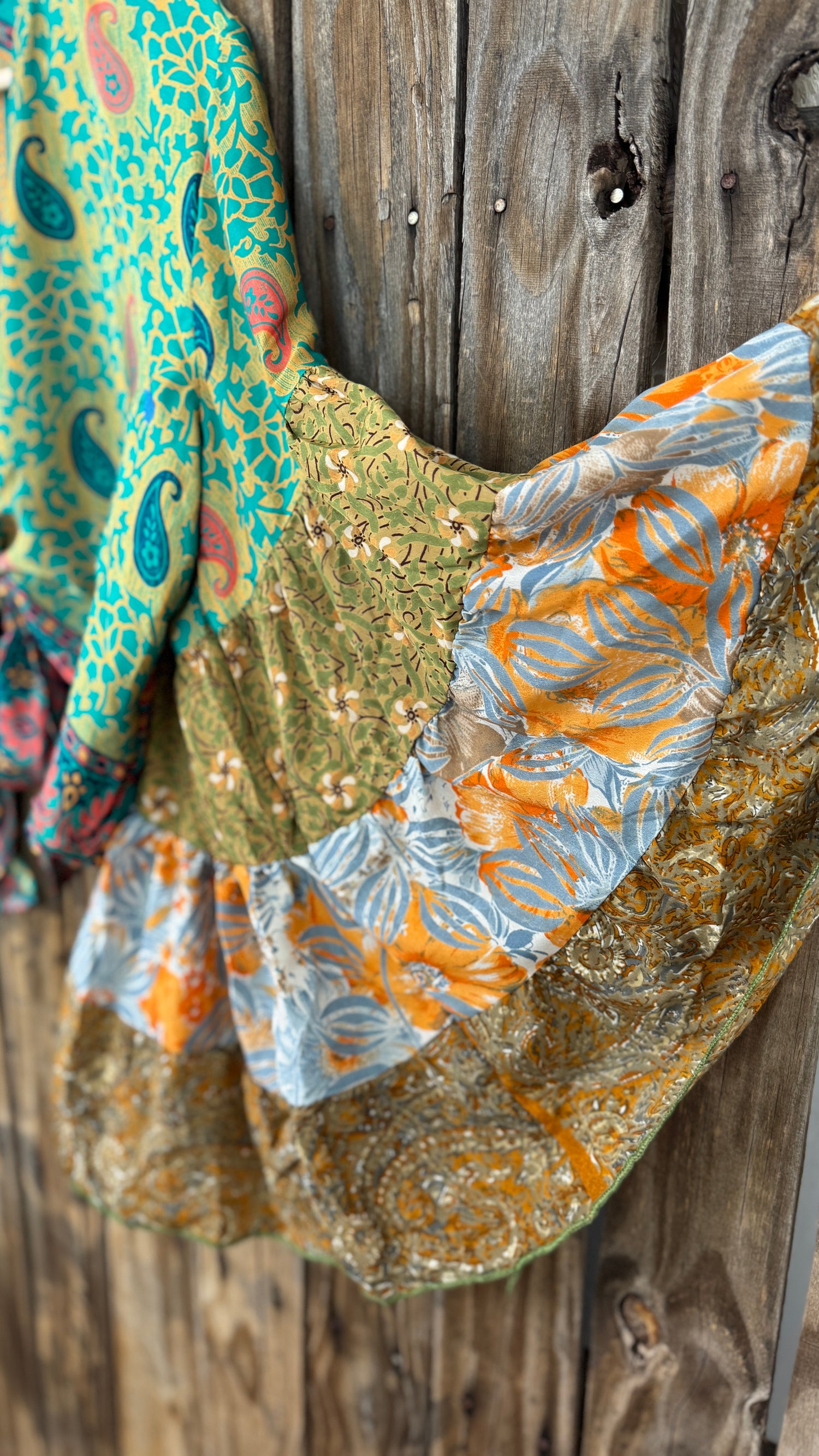 *Please note, each ethically made piece is handmade and fabricated from upcycled textiles. Texture of fabric and measurements may vary from each individual piece, even within the same style of garment; small stray threads, inconsistent coloring, and fabric imperfections are common with this style and do not indicate a flaw. Many of our items have lived a life long before reaching your closet, so each piece is unique and may come with slight imperfections (such as minor stains and inconsistencies in pattern, thinning areas or small holes/repairs, and varied texture of silk with each individual garment). We celebrate these one-of-a-kind characteristics, as they do not impact the function of the garment, and encourage you to review all photos and descriptions carefully. As always, please reach out with any questions if you need further clarification. All sales are final. View the entirety of our store policies HERE