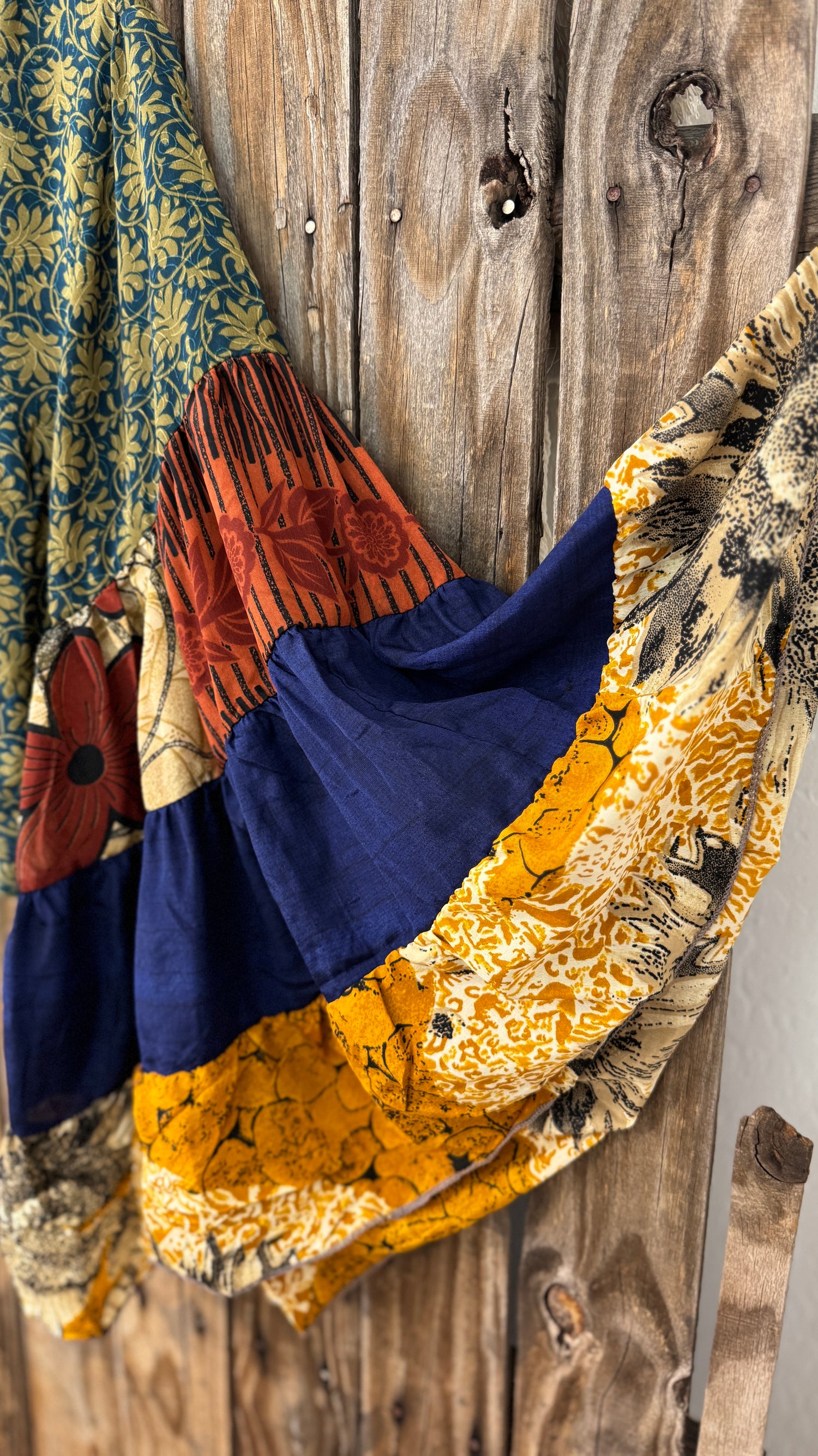 *Please note, each ethically made piece is handmade and fabricated from upcycled textiles. Texture of fabric and measurements may vary from each individual piece, even within the same style of garment; small stray threads, inconsistent coloring, and fabric imperfections are common with this style and do not indicate a flaw. Many of our items have lived a life long before reaching your closet, so each piece is unique and may come with slight imperfections (such as minor stains and inconsistencies in pattern, thinning areas or small holes/repairs, and varied texture of silk with each individual garment). We celebrate these one-of-a-kind characteristics, as they do not impact the function of the garment, and encourage you to review all photos and descriptions carefully. As always, please reach out with any questions if you need further clarification. All sales are final. View the entirety of our store policies HERE.
