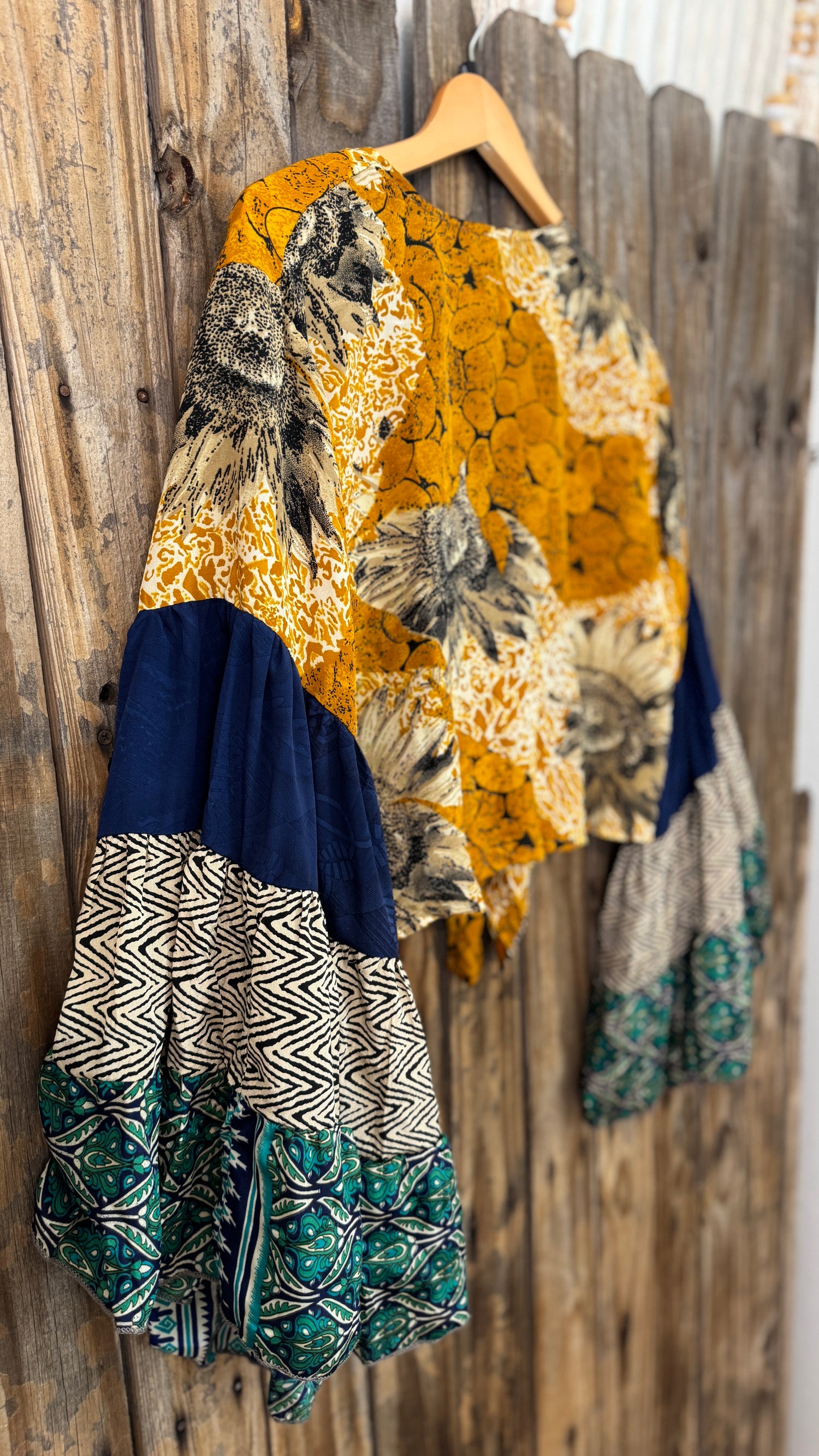*Please note, each ethically made piece is handmade and fabricated from upcycled textiles. Texture of fabric and measurements may vary from each individual piece, even within the same style of garment; small stray threads, inconsistent coloring, and fabric imperfections are common with this style and do not indicate a flaw. Many of our items have lived a life long before reaching your closet, so each piece is unique and may come with slight imperfections (such as minor stains and inconsistencies in pattern, thinning areas or small holes/repairs, and varied texture of silk with each individual garment). We celebrate these one-of-a-kind characteristics, as they do not impact the function of the garment, and encourage you to review all photos and descriptions carefully. As always, please reach out with any questions if you need further clarification. All sales are final. View the entirety of our store policies HERE.