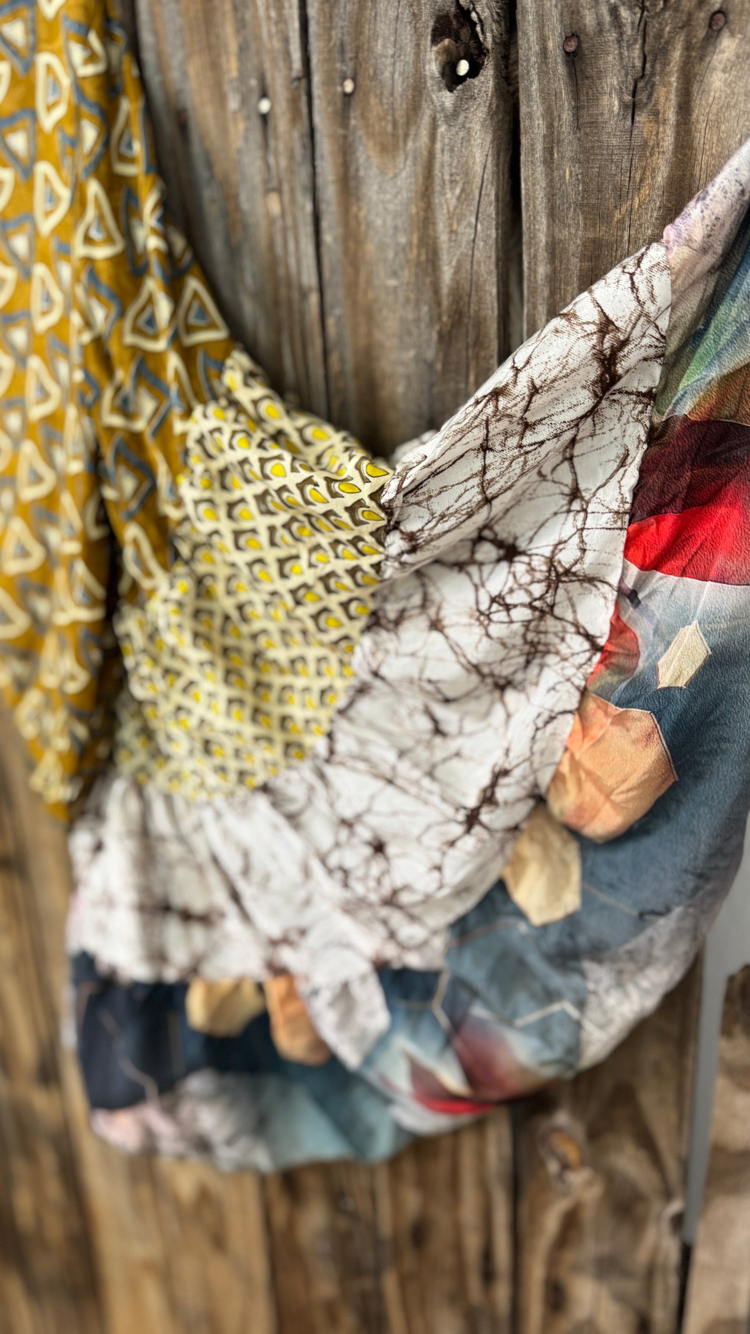 *Please note, each ethically made piece is handmade and fabricated from upcycled textiles. Texture of fabric and measurements may vary from each individual piece, even within the same style of garment; small stray threads, inconsistent coloring, and fabric imperfections are common with this style and do not indicate a flaw. Many of our items have lived a life long before reaching your closet, so each piece is unique and may come with slight imperfections (such as minor stains and inconsistencies in pattern, thinning areas or small holes/repairs, and varied texture of silk with each individual garment). We celebrate these one-of-a-kind characteristics, as they do not impact the function of the garment, and encourage you to review all photos and descriptions carefully. As always, please reach out with any questions if you need further clarification. All sales are final. View the entirety of our store policies HERE.