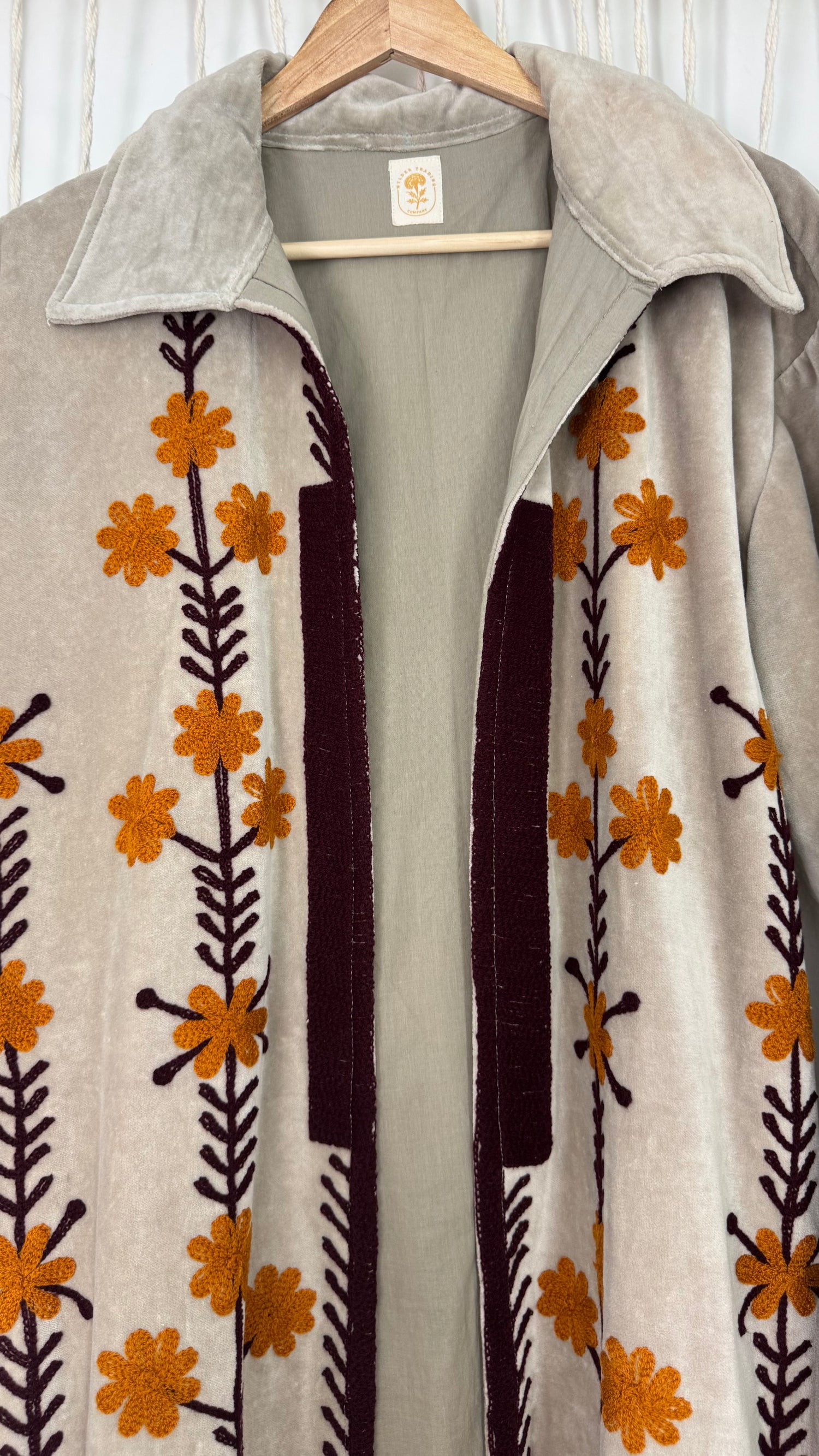 Velvet Vetiver Duster Embroidered Coat (Grey w/ Maroon and Mustard Stitching)