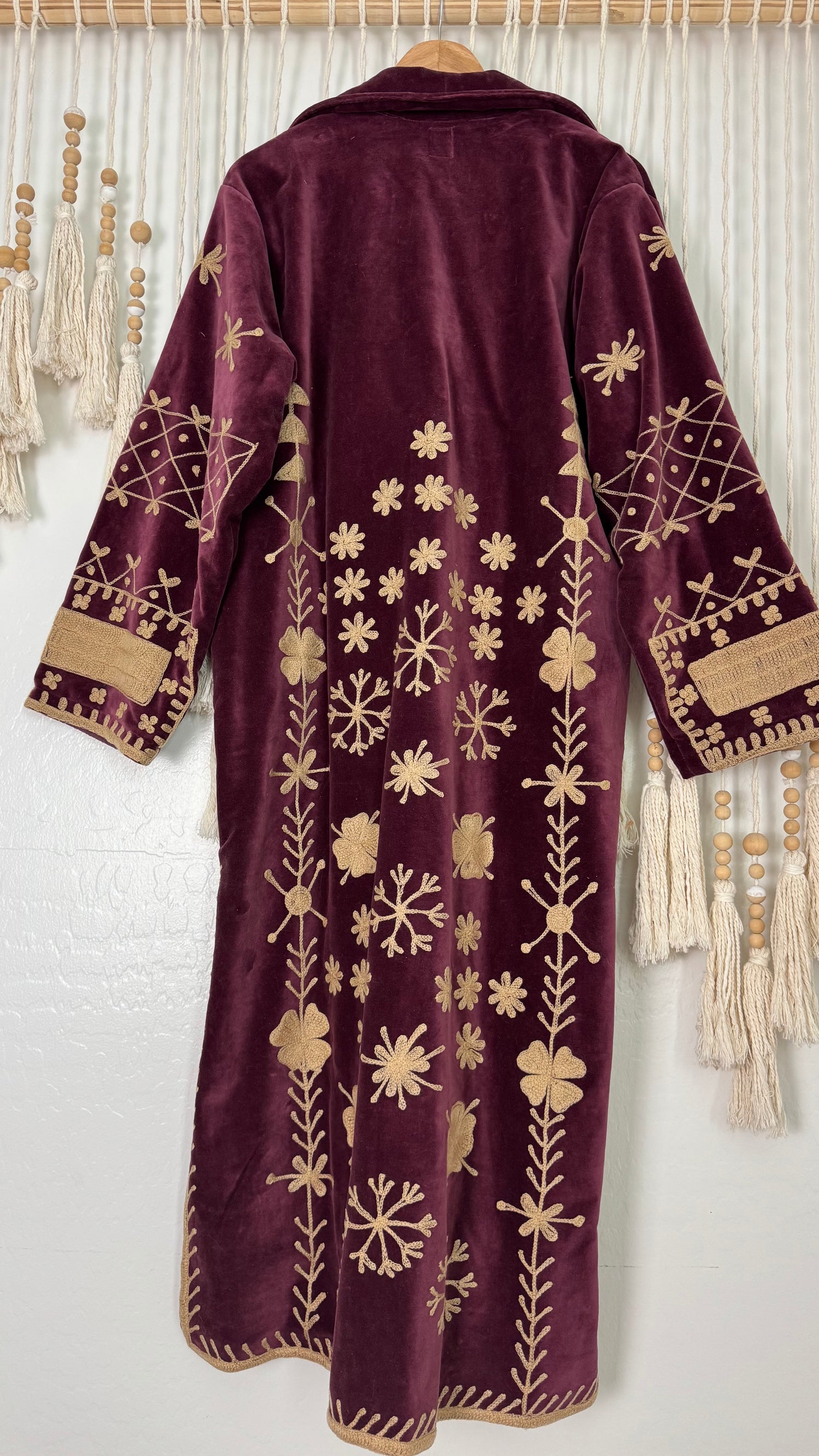 Velvet Vetiver Duster Embroidered Coat (Plum w/ Beige Stitching)
