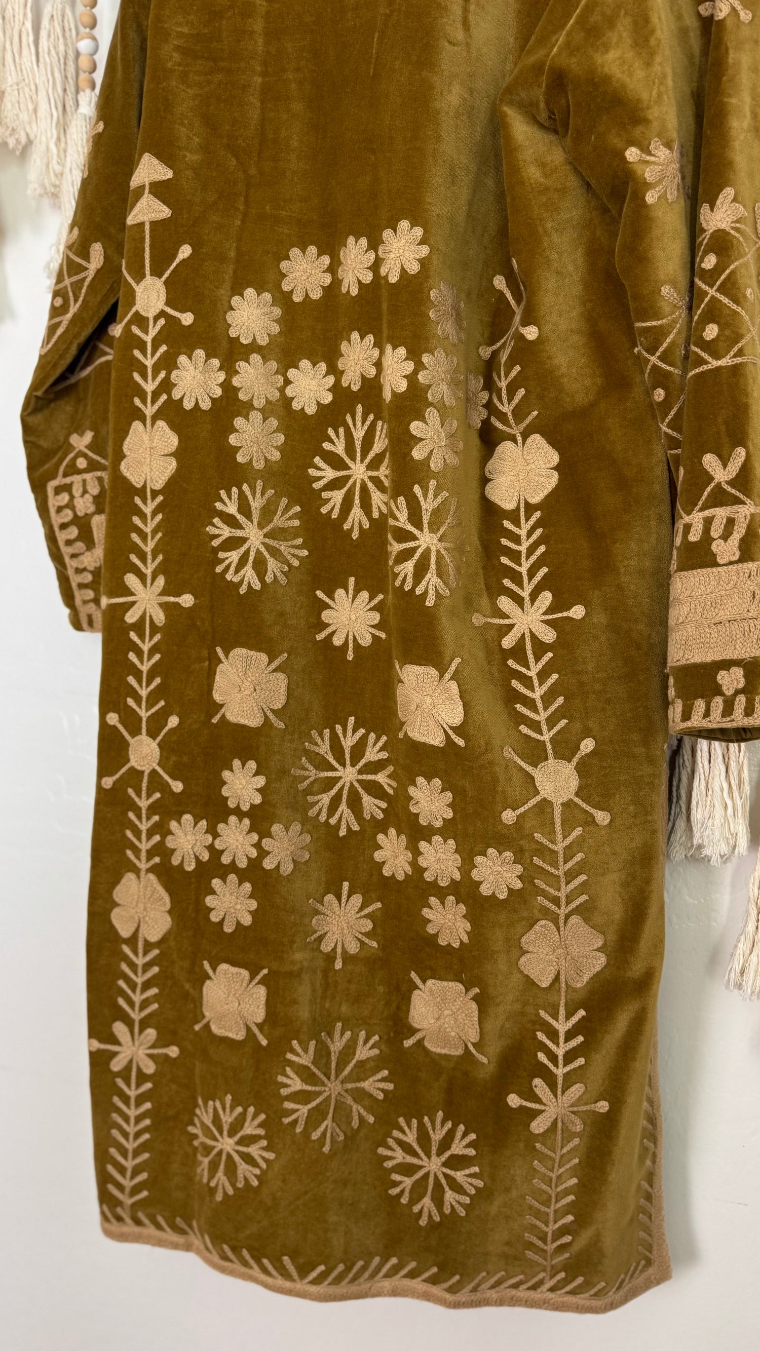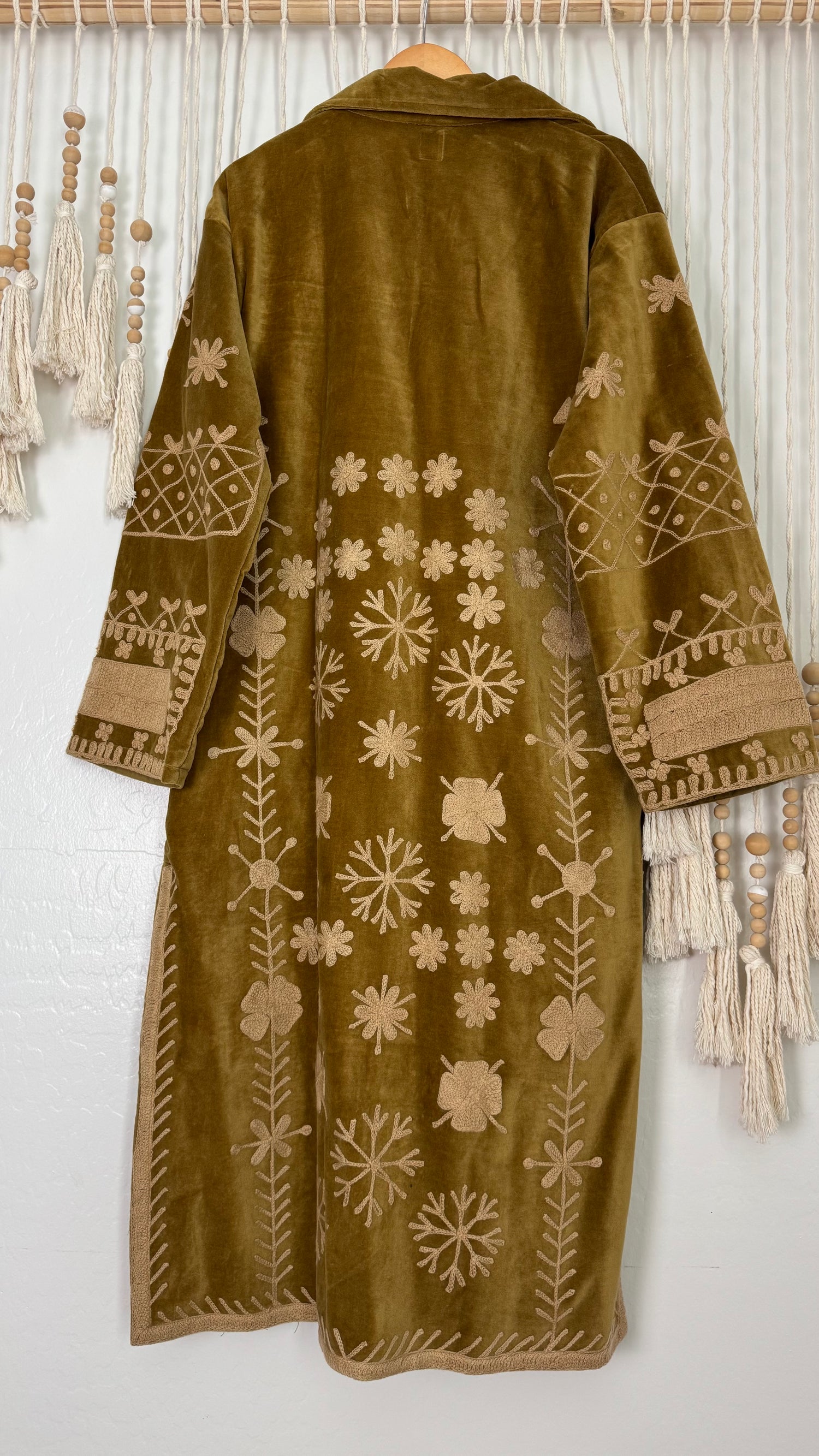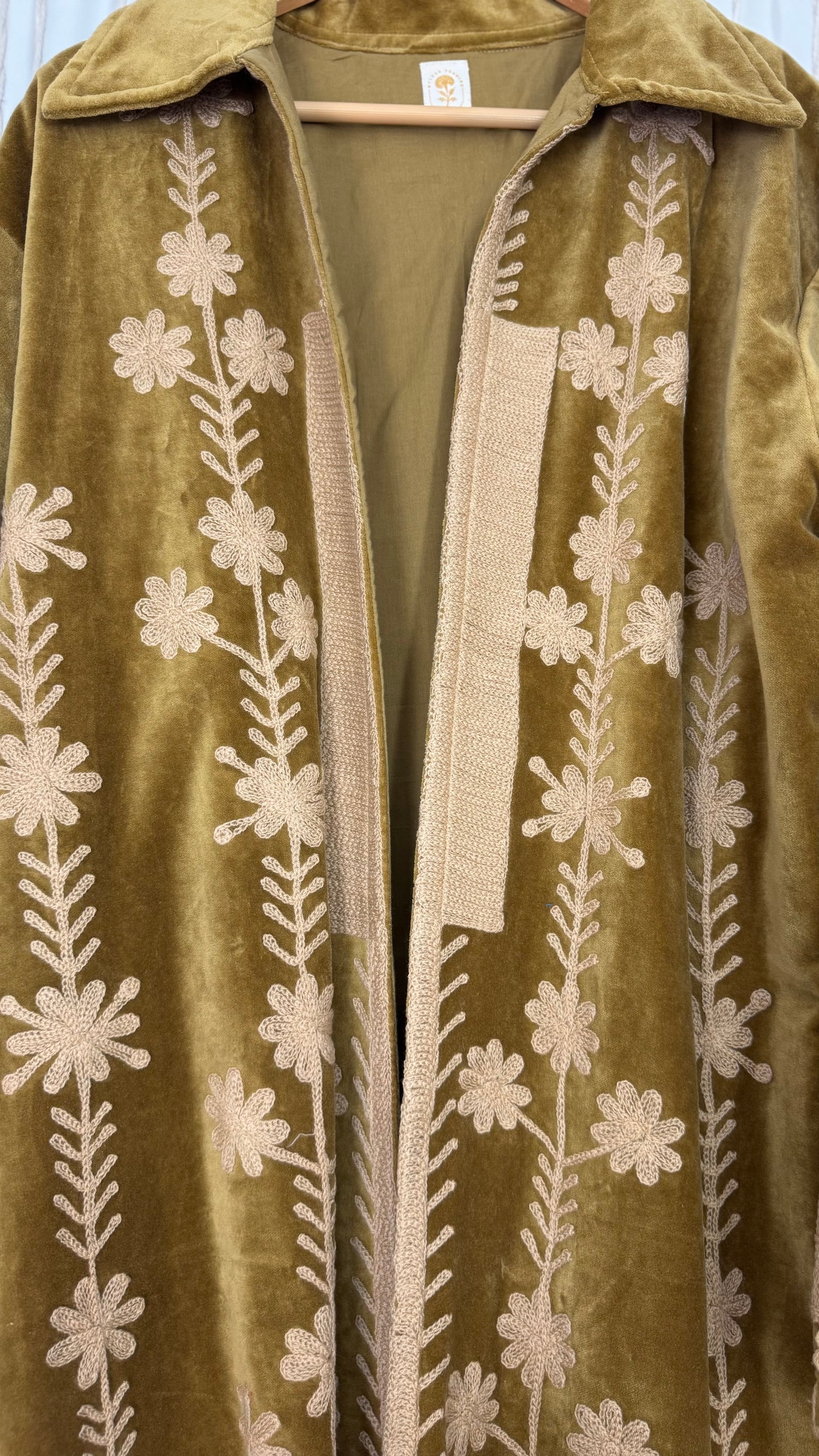Velvet Vetiver Duster Embroidered Coat (Gold w/ Beige Stitching)