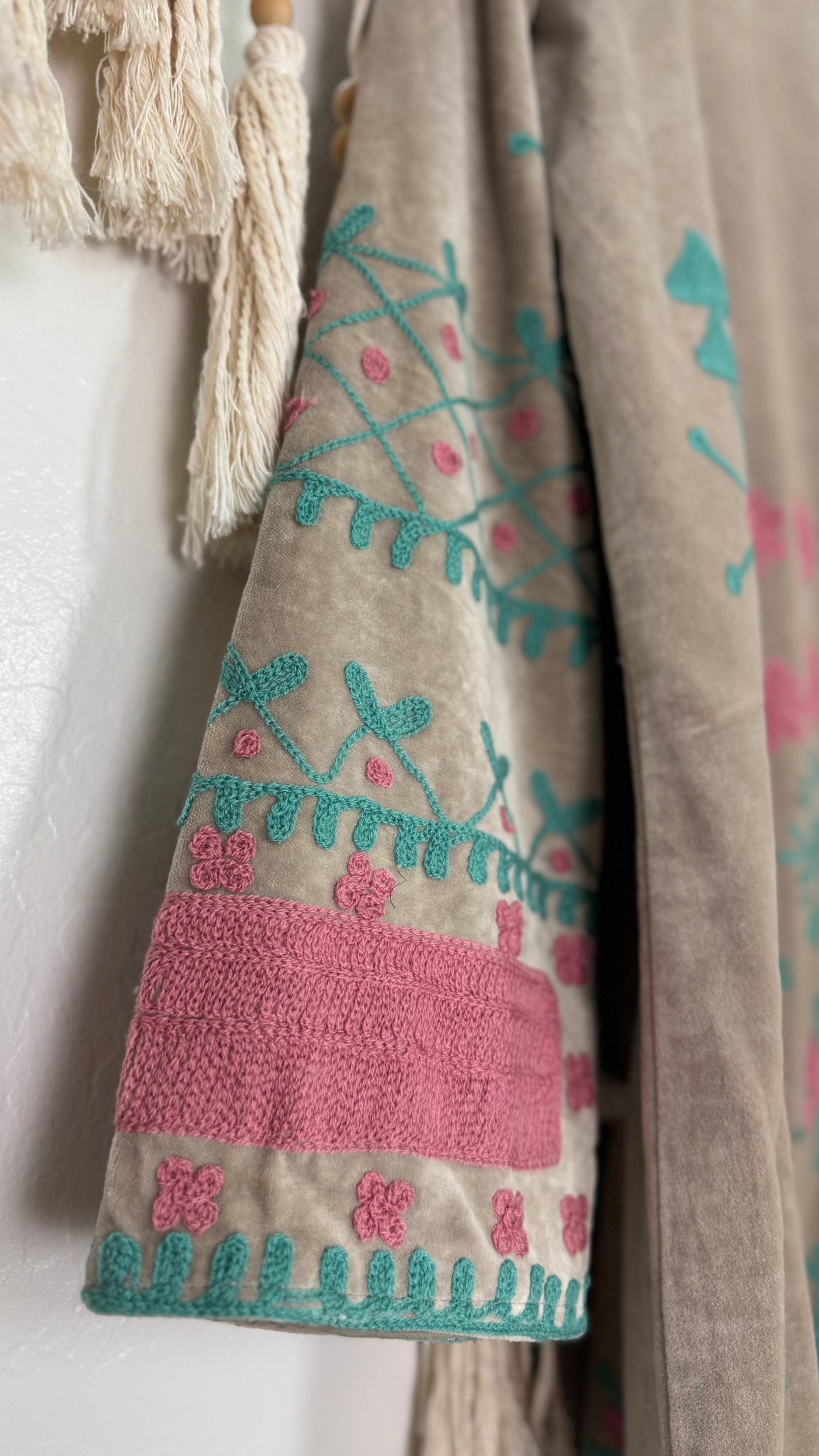 Velvet Vetiver Duster Embroidered Coat (Grey w/ Pink and Turquoise Stitching)